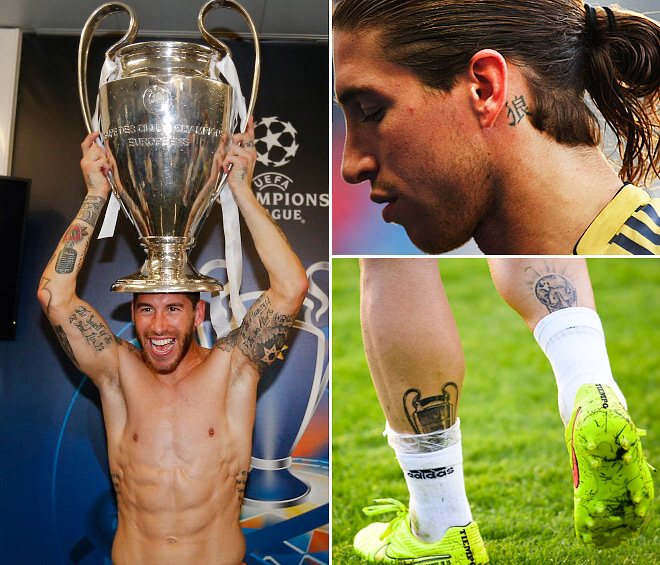 The tattoos of Sergio Ramos are known to everyone with little or no knowledge of soccer. However, even the defender's fans can get confused with them - there are so many of them. The first one young Sergio made when he was 14 years old - a goblin with a ball. His father was terribly displeased. Since then, almost no part of the body of Ramos did not remain uncovered. Most tattoos have a symbolic meaning. For example, the initials of his parents, the Latin wisdom "The spirit of the dead lives in the memory of the living," the icon on his left shoulder, the Star of David in memory of his grandmother, the Chinese character for "wolf," which resembles the initials of Sergio himself, behind the ear. There are the initials of his wife and children, his brother and sister on his wrist and finger (and his brother has the exact same initials). There are dates of terrorist attacks in the U.S. and Madrid. There is a soccer collection of tattoos - his own number 4, in memory of the deceased Antonio Puerta. Finally, the last masterpieces are the two major trophies in Ramos' career: the Champions League and the World Cup. Each of the cups is emblazoned on the back of the defender's shins.