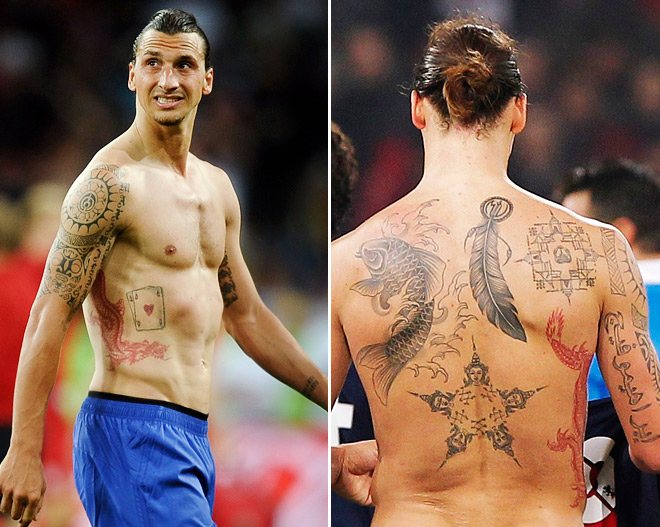 The red dragon and cards on his right side, the "Ibrahimovic code" on his wrists, the carp on his back.
