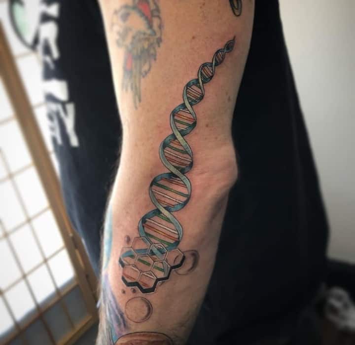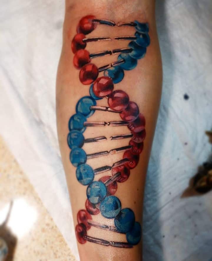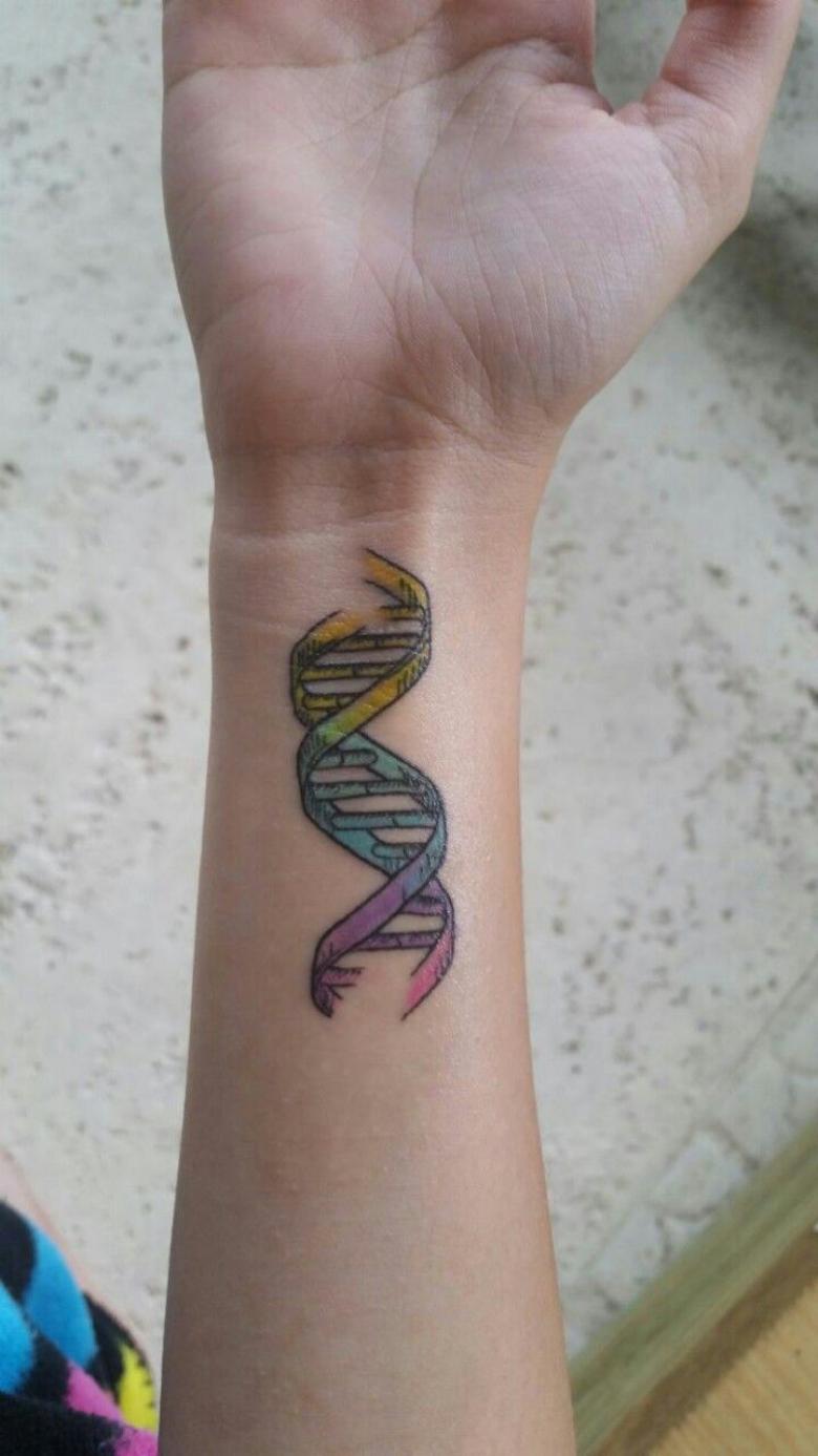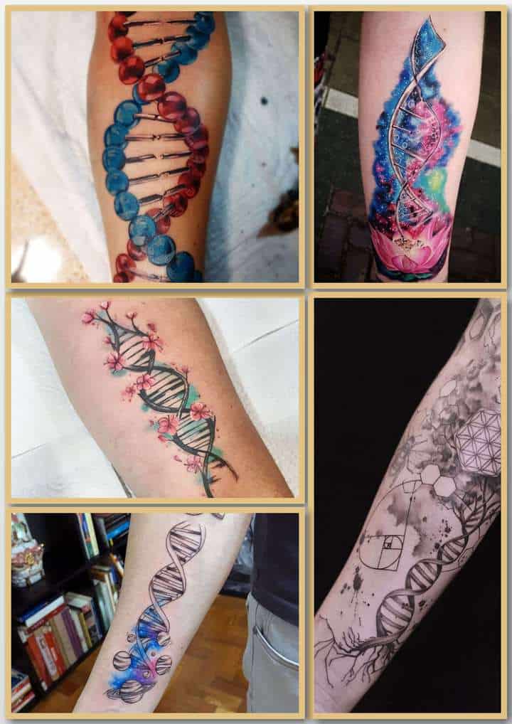 Actors with a sense of humor can express in a tattoo the peculiarities of their character, appearance. For example, they can get a DNA tattoo consisting of multicolored links. Sometimes they are even connected randomly. But this does not indicate the stupidity of the person or his failure as a scientist. It's just a character trait that helps him or her unfold in his or her chosen field of science.