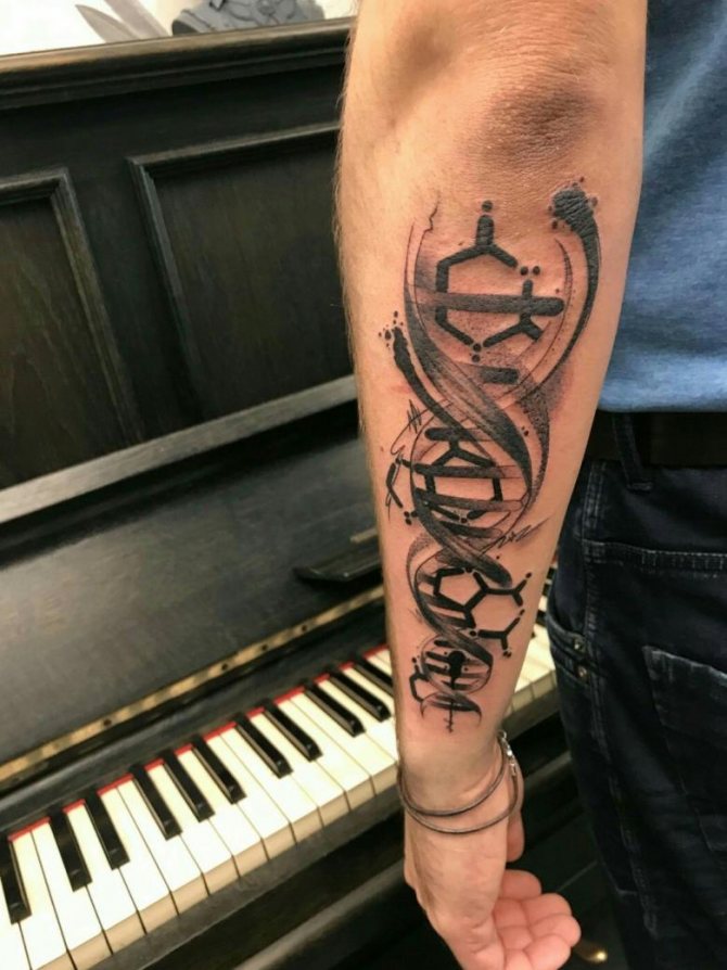 In men, the DNA tattoo also denotes his belonging to scientific circles. As a rule - it is a microbiologist and is immersed in genetic engineering. In this case, the profession and field of fascination lie on the same plane. It is common to say about such symbiosis that a person has found his vocation. It means he is satisfied and in demand. The tattoo of macromolecules will further strengthen the owner in the right choice of life's path.