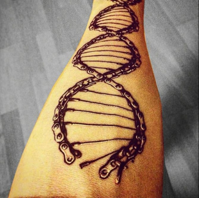 Tattoo chains DNA has long ago won its place in the tattoo culture. Certain segments of the population continue to decorate their bodies with the pattern of the molecule. In appearance and essence, the image of the macromolecule is positive. To the owner of the tattoo it can carry only positive emotions. It probably has no esoteric function.