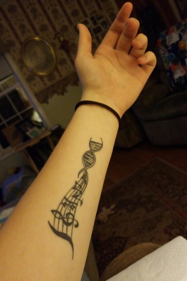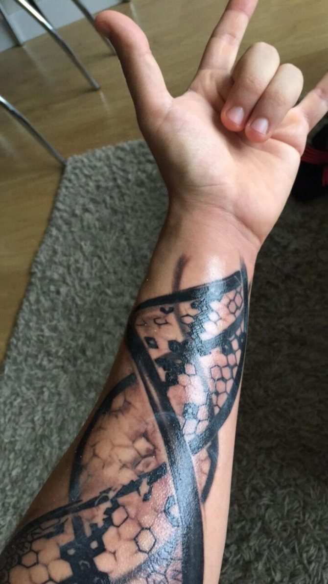 And the tattoo of the DNA molecule makes us think about the origin and evolution of all living things and about the capabilities of man as a result of the discovery of this molecule.