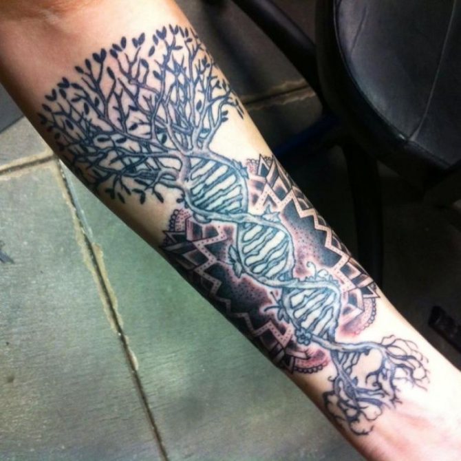 The connection with previous generations and in general to all life on the planet symbolizes the tattoo, where the double helix of DNA is represented as a tree trunk. Tattoos with philosophical connotations are preferred by girls who have formed the worldview, keeping their principles, able to look at the world in a non-standard way. An unusually broad outlook makes them interesting and wise interlocutors.