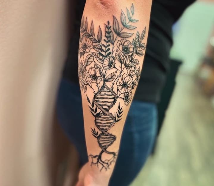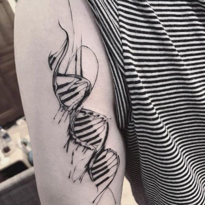 A DNA tattoo is a symbol of an intelligent, well-read and scientific person. Often such a drawing on the body is not just a tribute to fashion, but a sign of professional interest in the study of the genome. The tattoo is chosen by girls, whose career is associated with scientific research or laboratory research of DNA.