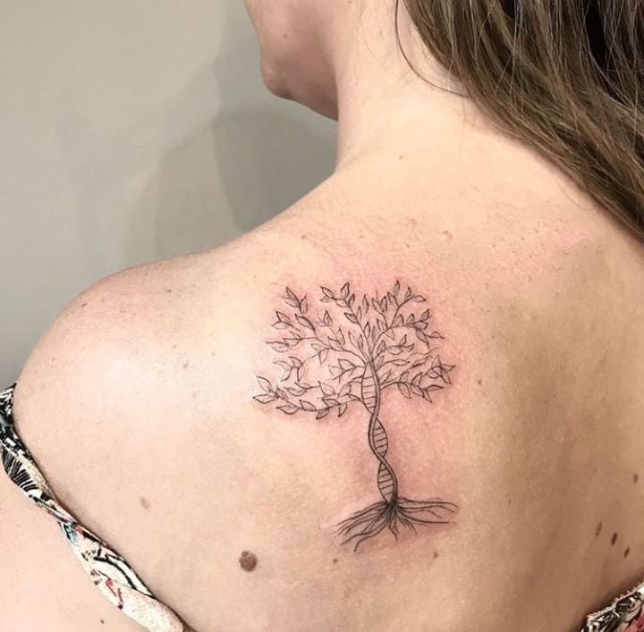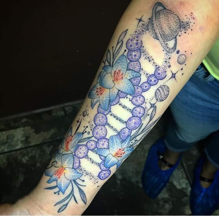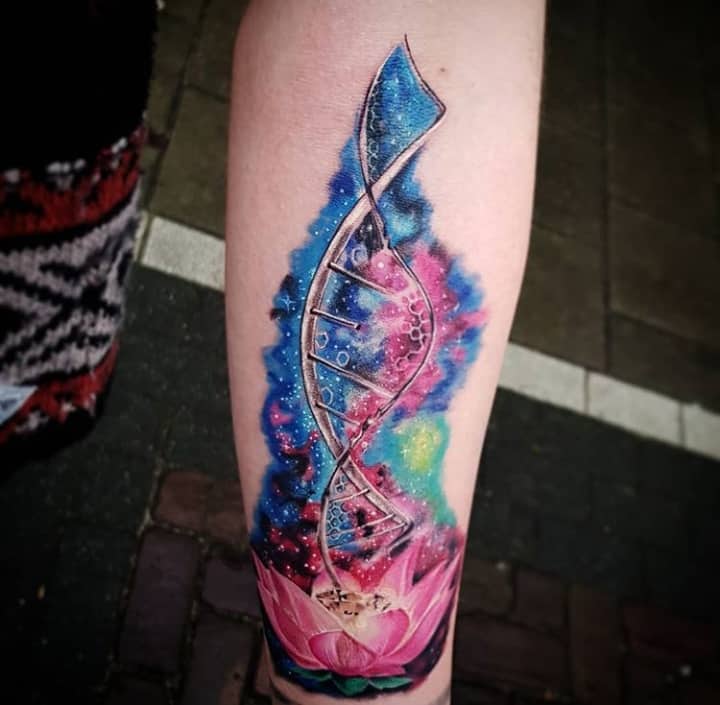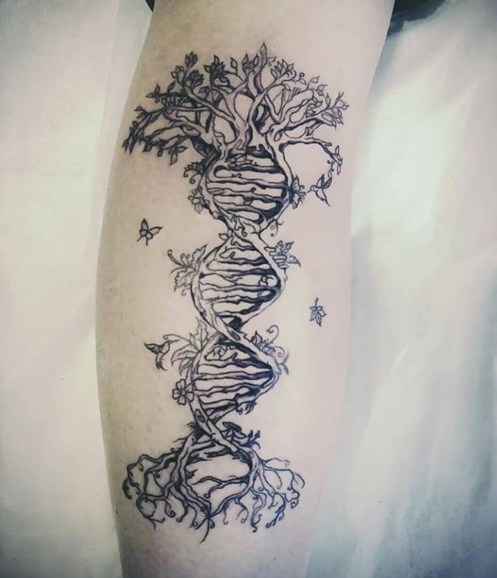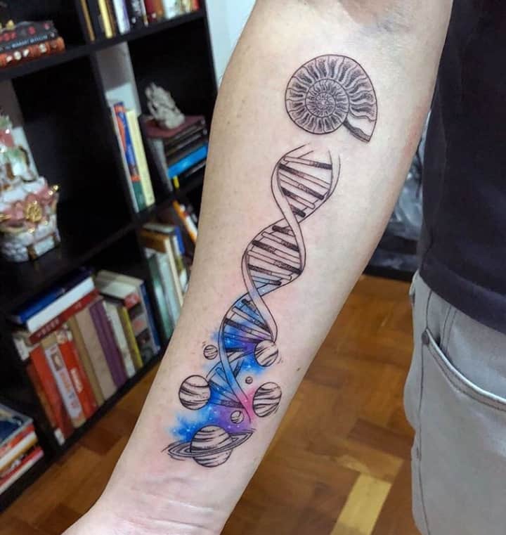 Among scientists, there are those who like simple drawings, like from a science book. Without any embellishments. Such a real tattoo of a DNA molecule refers immediately to the scientific background of the symbol. Though attractive in appearance, the tattoo awakens thoughts about the origin/development of mankind, makes us look for ways to study civilizations that existed before.