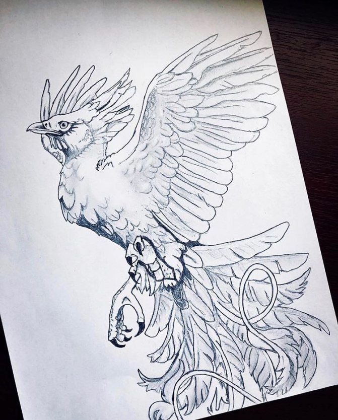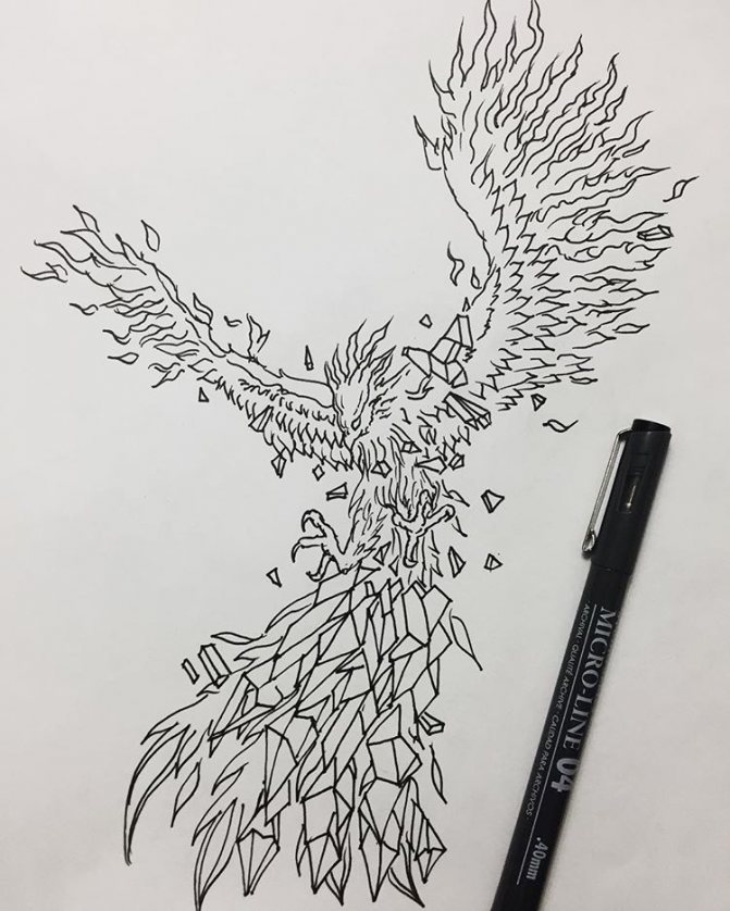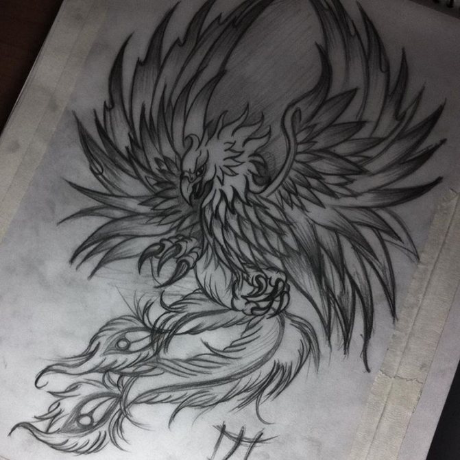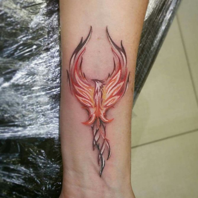 Often the phoenix is chosen by girls with a "fiery" character, it is a bright, extraordinary and creative personality. Among girls, small tattoos are more common, some of them depict the phoenix schematically. Popular places: scapula, back, hands.