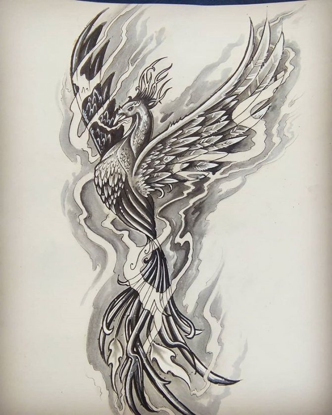 The main colors that are used when applying the sketch: red, symbolizing fire, yellow or orange - the rays of the sun, shades of gray - ash, death and rebirth. But also lovers of monochrome drawings phoenix tattoo will do. By doing so, you will be able to emphasize the power and freedom of this bird.