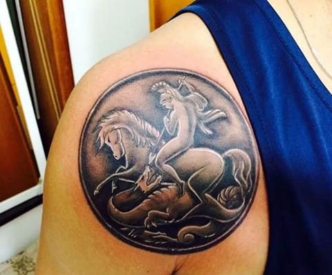 Look at online photos of tattoo George the Victorious, choose a suitable sketch and think carefully about what this tattoo means to you personally. For women, a drawing with a saint is a powerful talisman against evil. Such a tattoo will protect the mistress from lies and betrayal. Providence itself will lead the wearer to truth and victory.