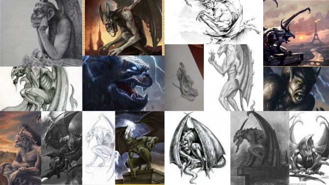 Traditionally, the gargoyle is depicted sitting in a waiting pose. If the picture want to give the grotesque, the position of the body create a sense of preparation before the jump. The muzzle is supplemented with a beak, mane and fangs.