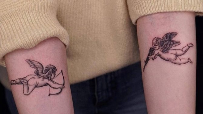 Any image of Cupid has to do with love. The paired symbol is very common among lovers. Such a tattoo denotes happiness and trust in a relationship.