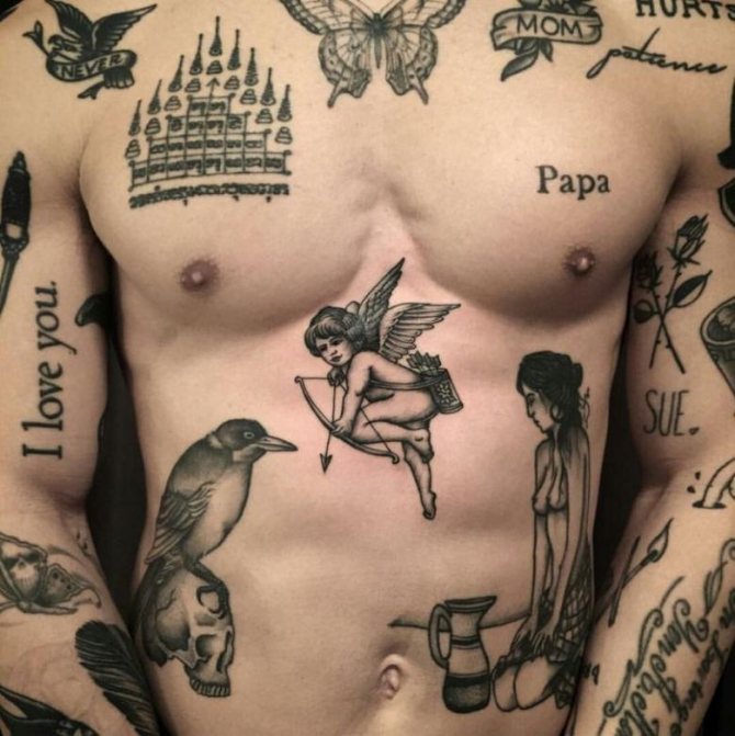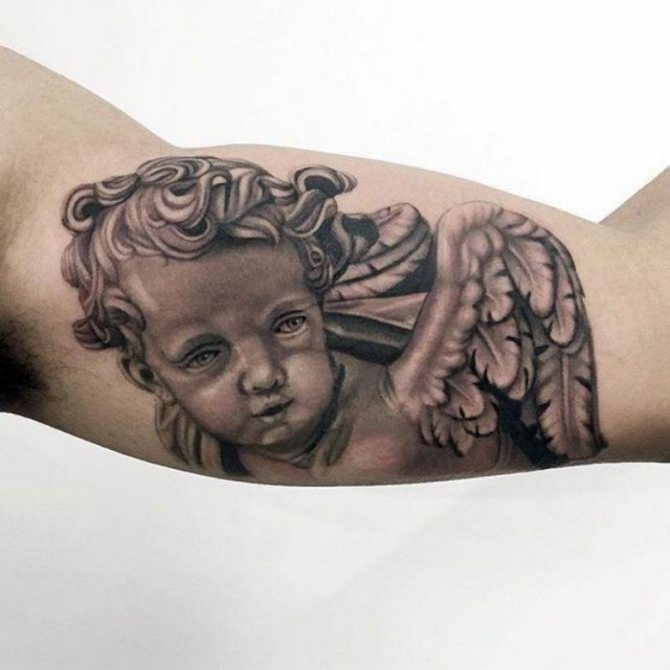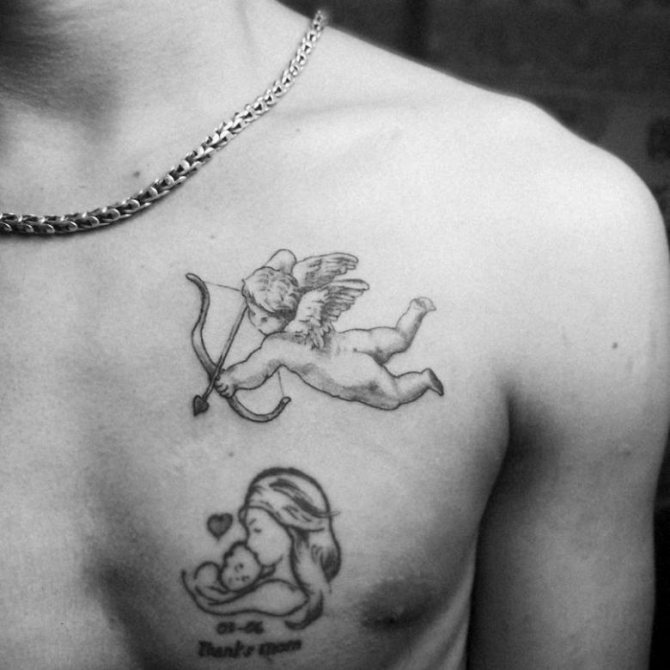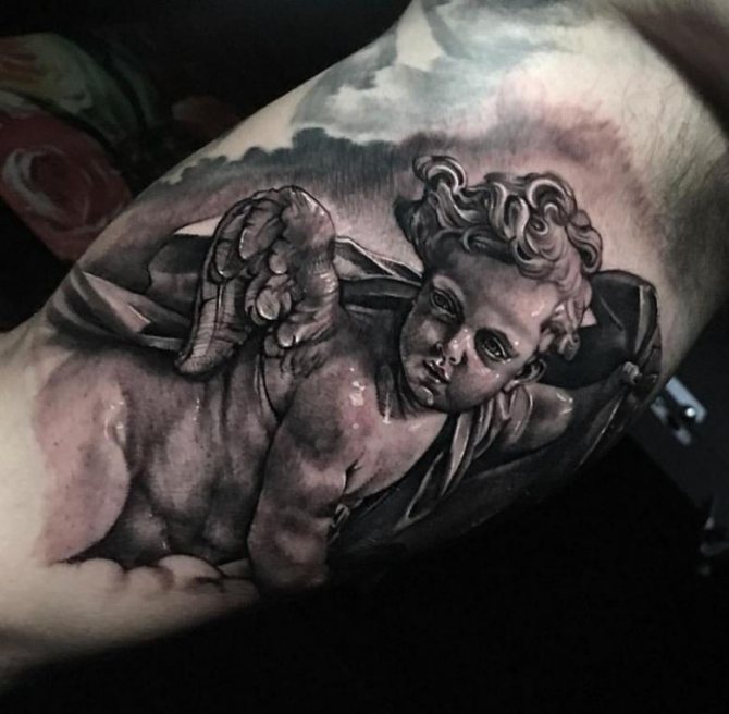 The grinning, mischievous Cupid on the body characterizes the bearer as a womanizer, who can conquer the heart of any girl. Guys in this category easily win the favor of women and always attract attention to themselves. A large number of love affairs and novels do not burden the owner of such a tattoo, on the contrary, new dates and high feelings inspire and give inspiration.