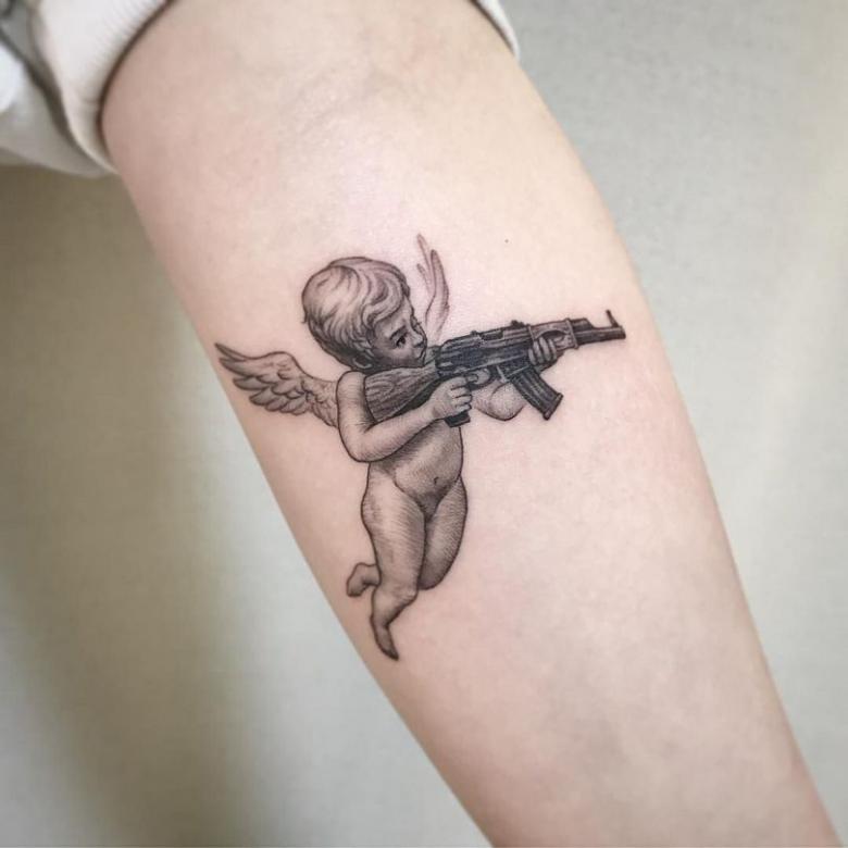 Tattoo with a sleeping Cupid and a folded gun can mean repeated disappointment or unsuccessful experience in a love relationship. It is likely that the bearer of the tattoo showed indifference on the part of a loved one or a partner did not appreciate it. Unsuccessful love is remembered for a long time, because of this tattoo with a tired angel symbolizes the sad history of love.