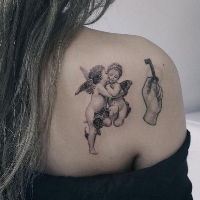 Girls who are not in a serious relationship get a tattoo of Cupid, with the goal of making true love. Tattoo, as a talisman, usually make a small, monochromatic performance, to place it on the body area, which is often hidden clothing. The main body of tattoo owners are shy and modest girls, their ultimate dream is to find a beloved partner and experience the feeling of true passionate love.