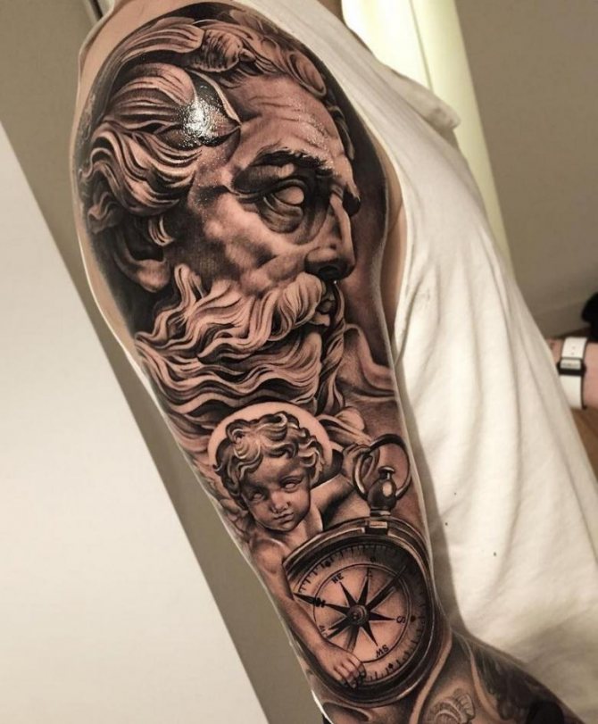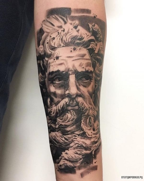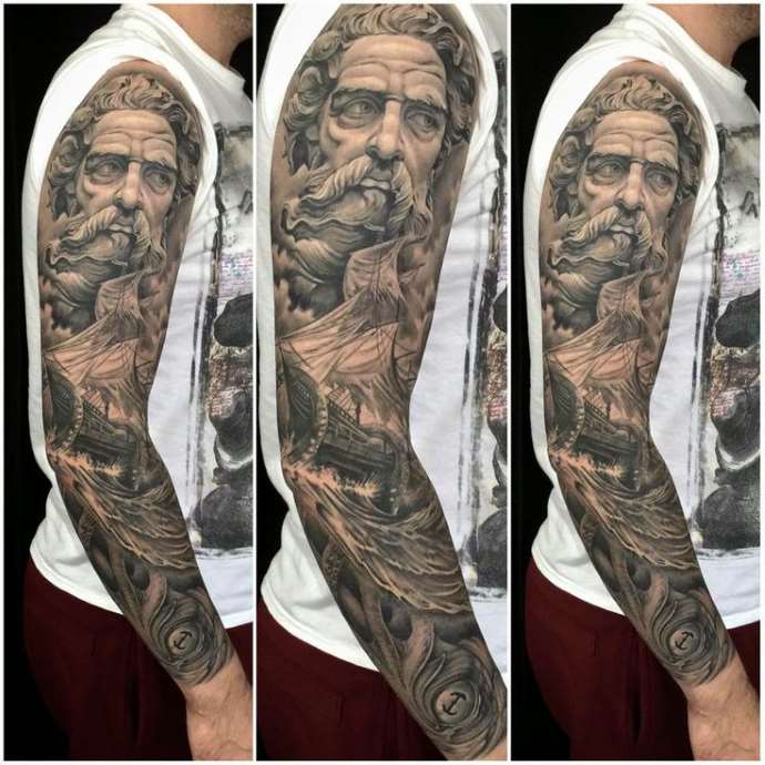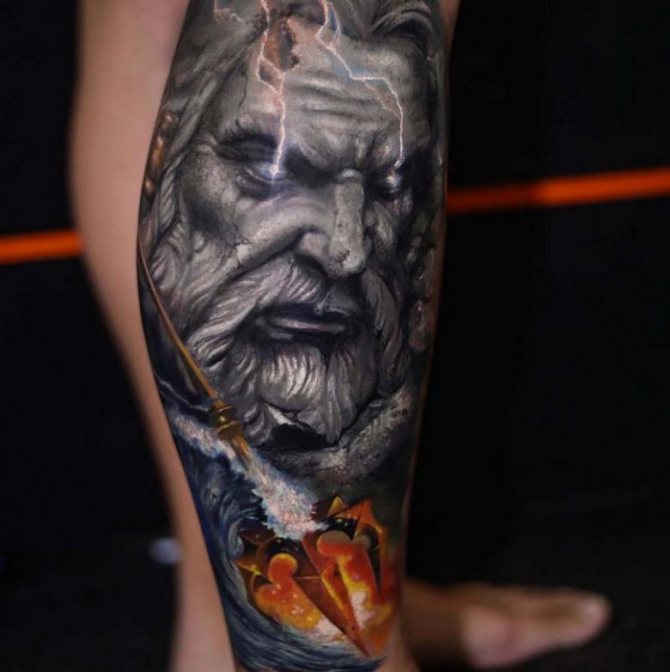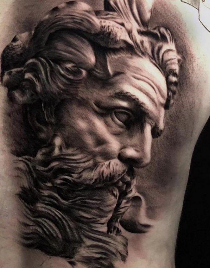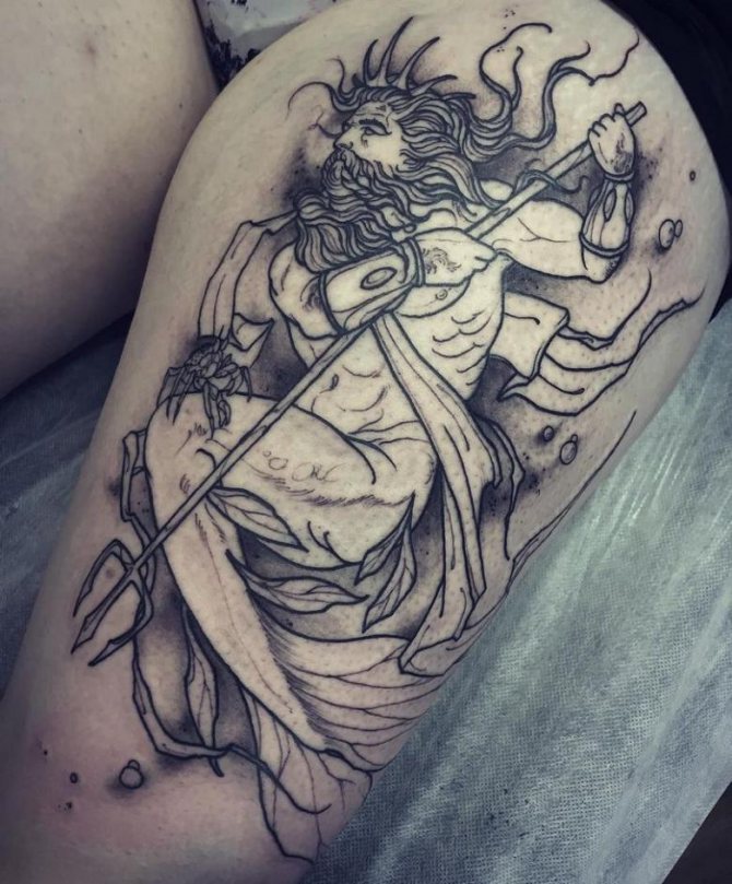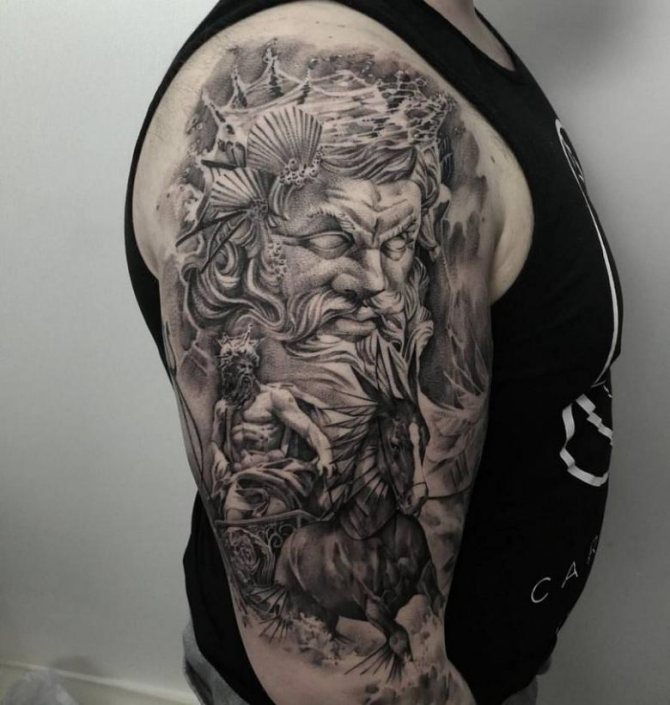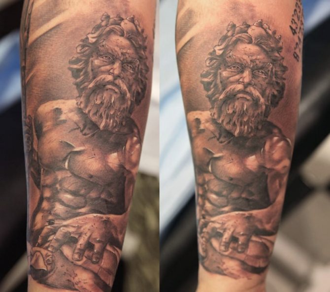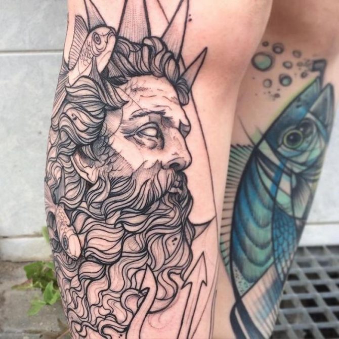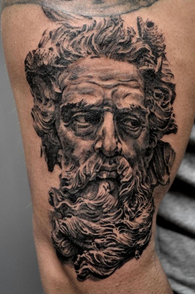 Tattoo in the form of Poseidon carries in itself a strong masculinity and the imprint of the cultural traditions of ancient peoples. Long gray hair symbolizes life wisdom and judgment, and the stern gaze of the deity denotes the opposition to lies and a stern temper.