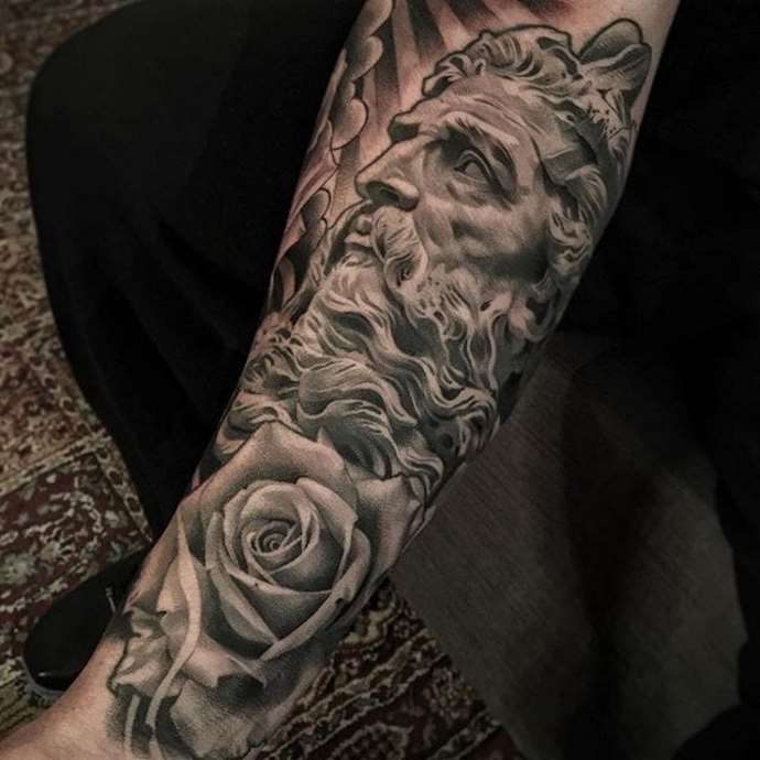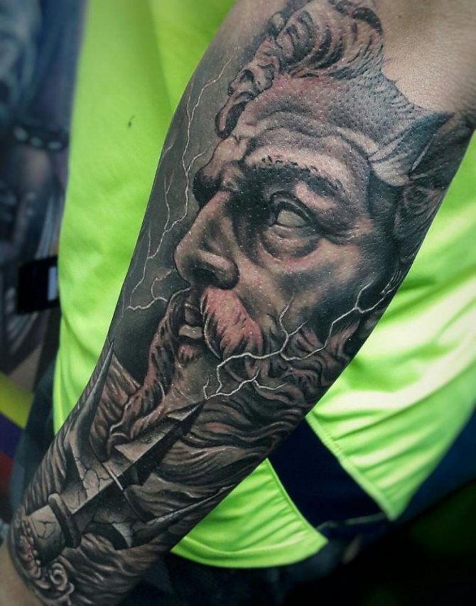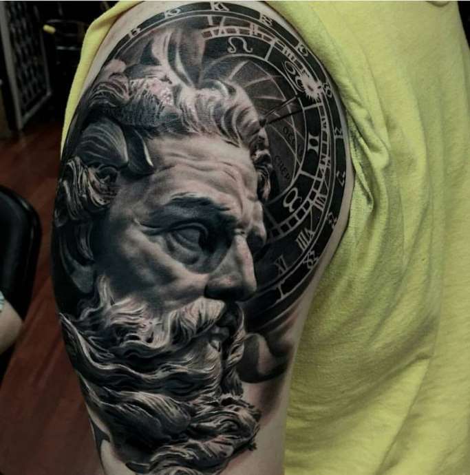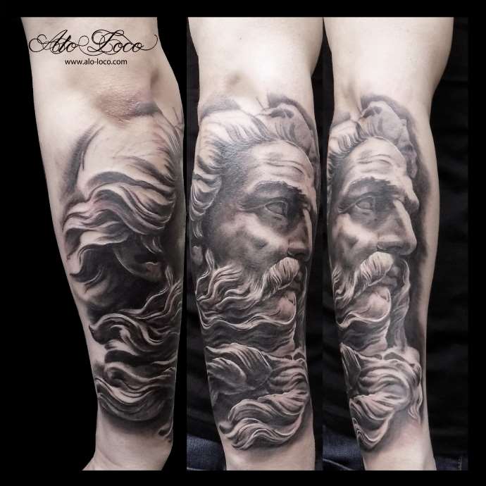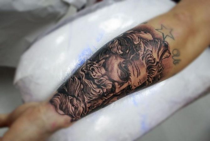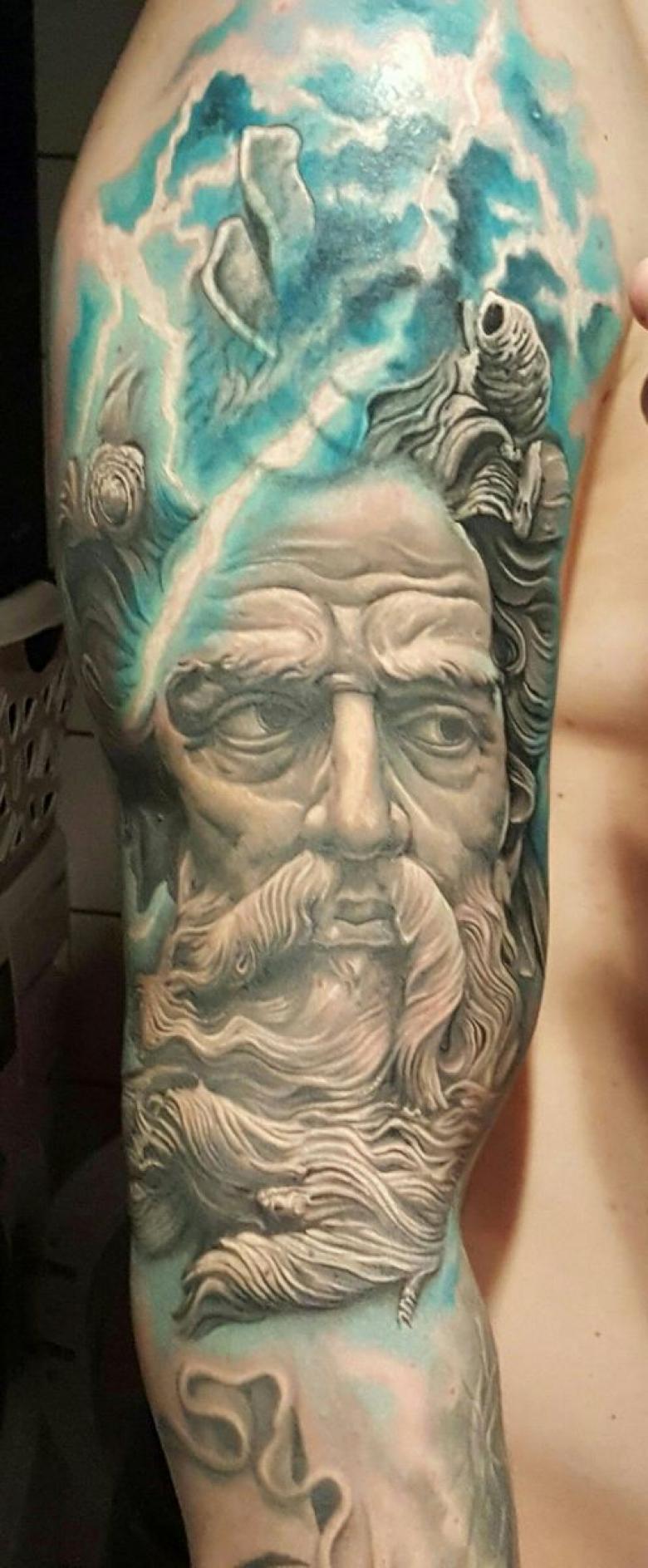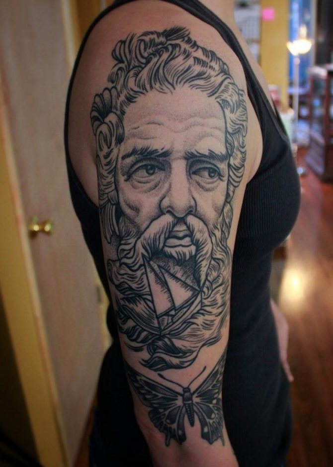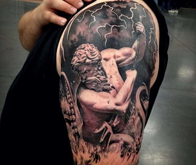 Tattoo in the form of Poseidon carries in itself a strong masculinity and the imprint of the cultural traditions of ancient peoples. Long gray hair symbolizes life wisdom and judgment, and the stern gaze of the deity denotes the opposition to lies and a stern temper.
