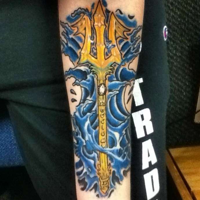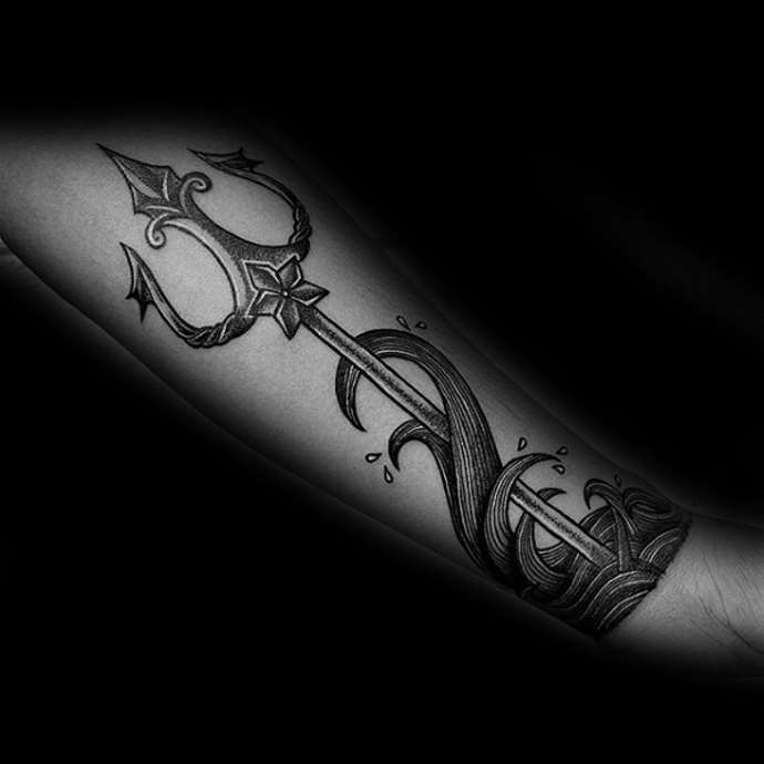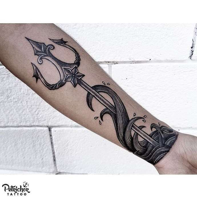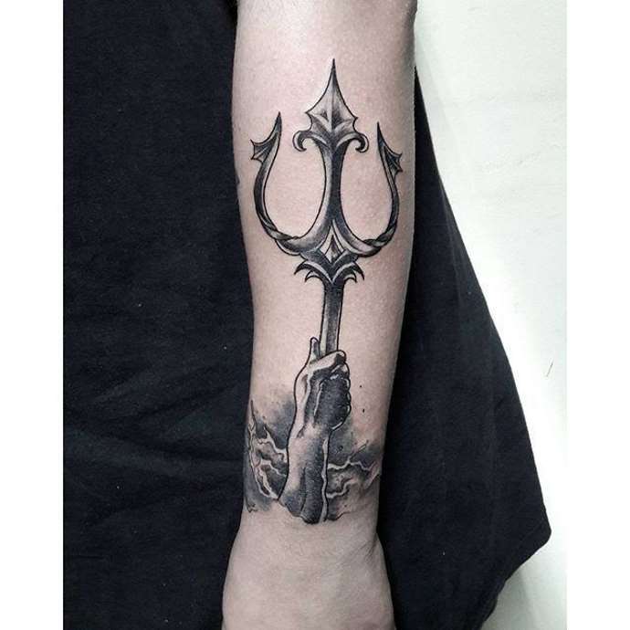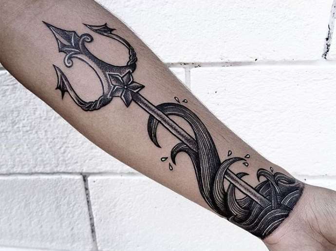 Any tattoo of Poseidon includes his famous weapon, with which the god administered justice and punished his enemies. With the trident, he broke in anger coastal rocks and drowned in the sea of whole islands. It is the chief attribute of this Greek deity and the symbol of his power. It is believed that the three prongs unite the symbolic past time, the present and the coming future.