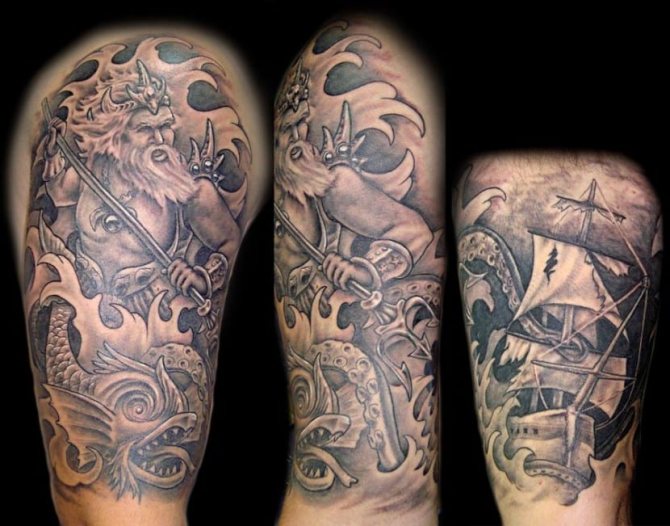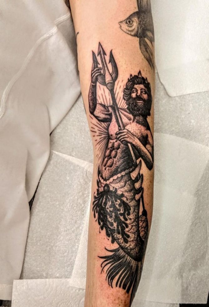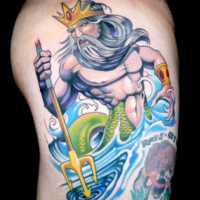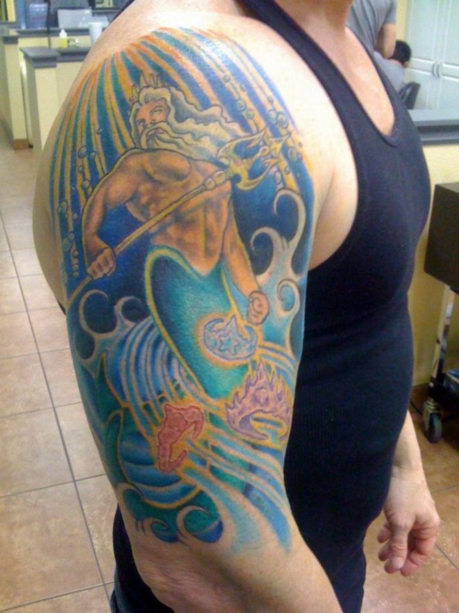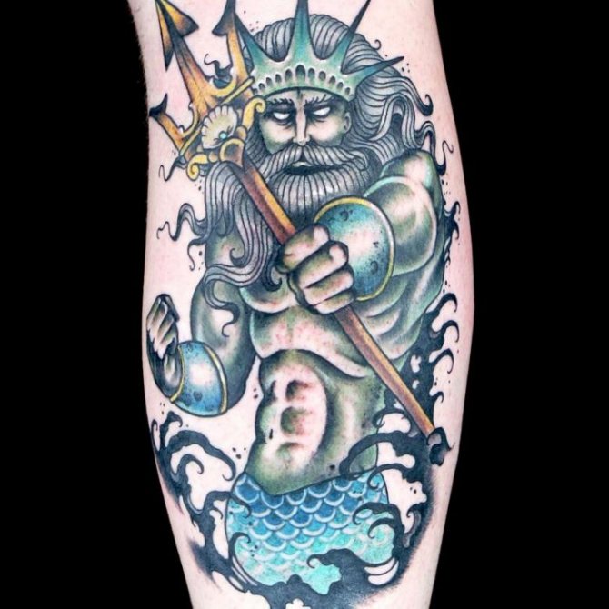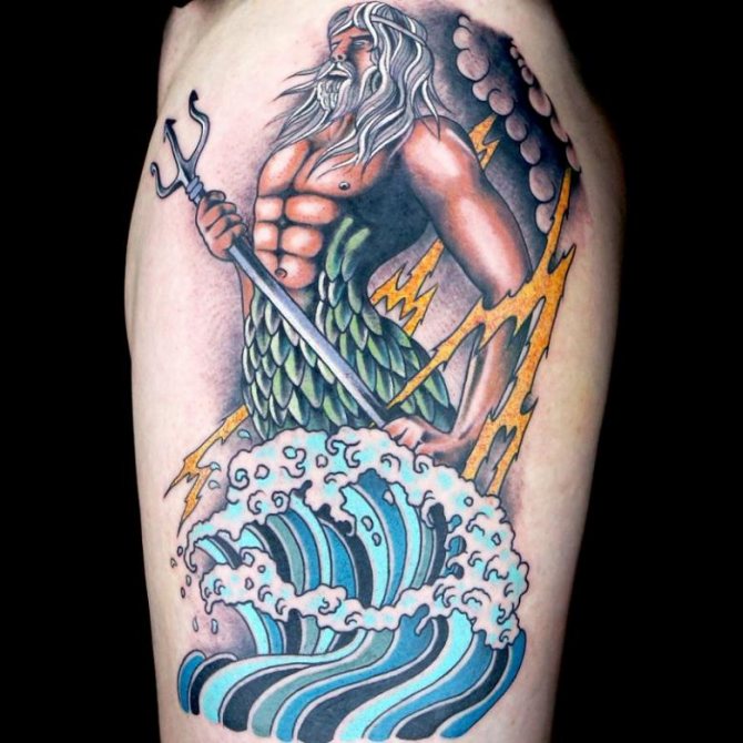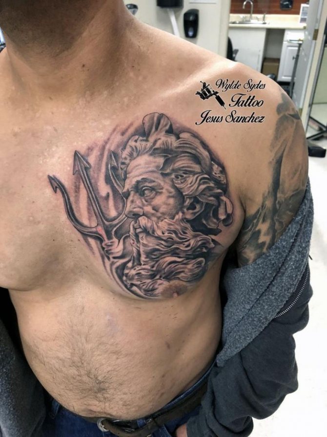 A great idea is a tattoo of the god of the seas on the chest. In this case, it will look very effective.