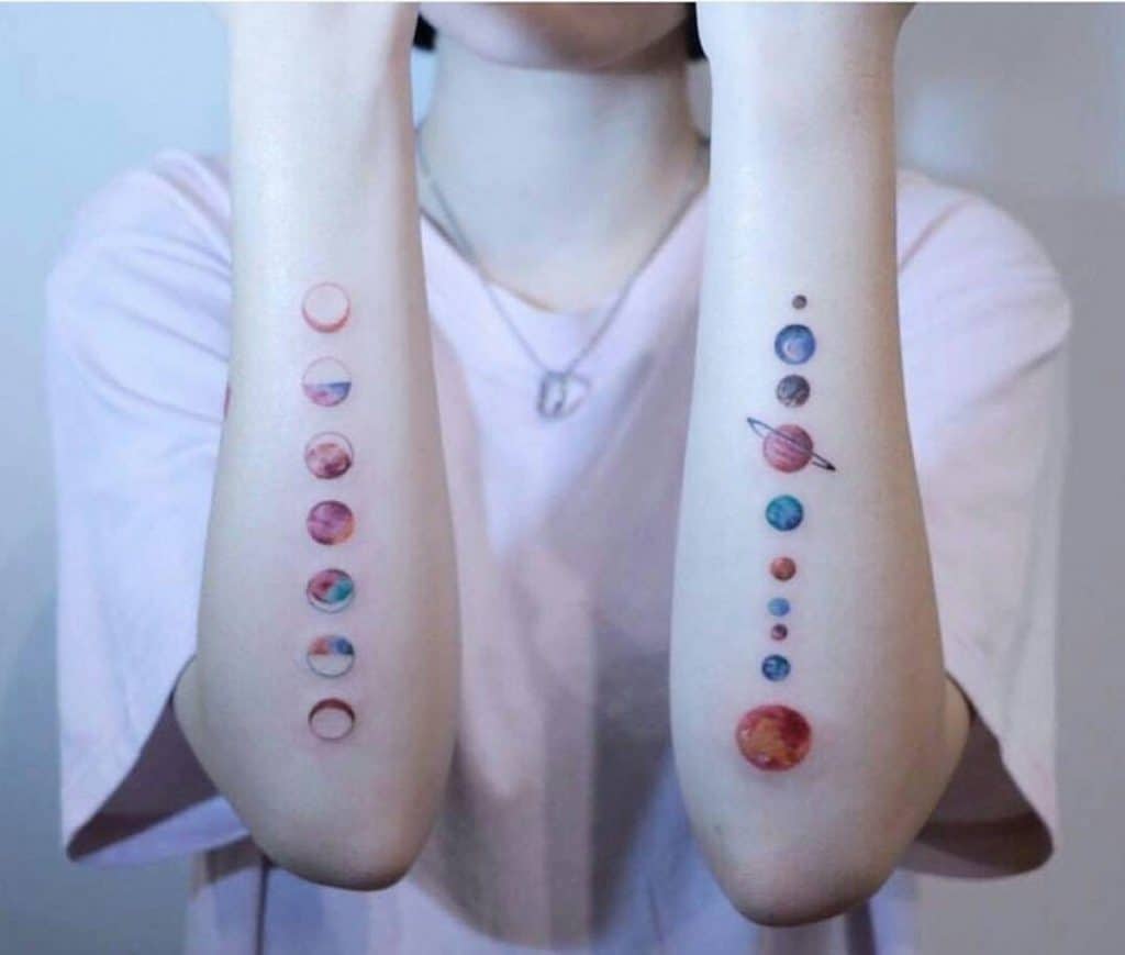 The owners of the parade of planets tattoo have a flexible way of thinking. They are very communicative and are able to look at the world from different angles. These people are excellent psychologists, able to stand in the place of another person, assessing the situation from his point of view.