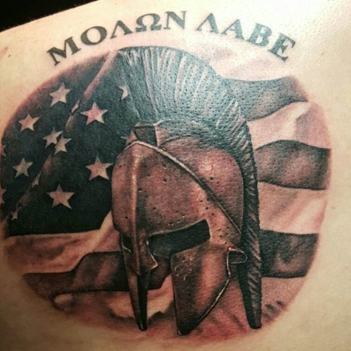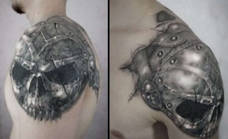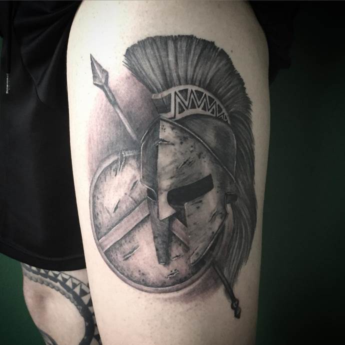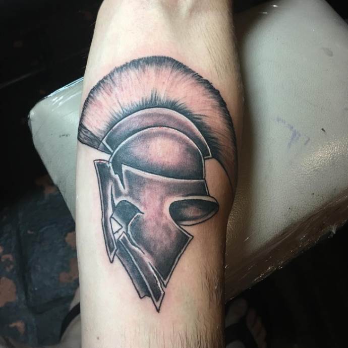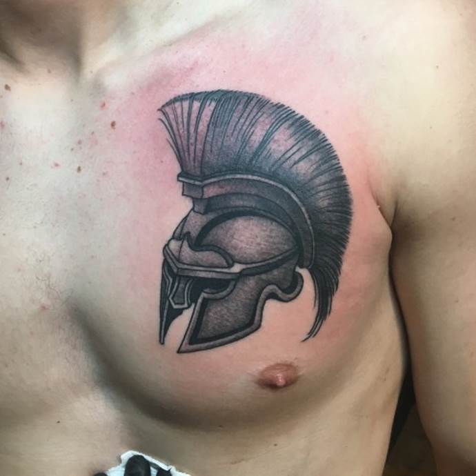 Fans of monochrome prefer the Dotwork or etching styles. Despite the use of only one color, the helmet tattoo looks voluminous and convex. Interesting sketches, as well as photos of finished tattoos are presented in the gallery.