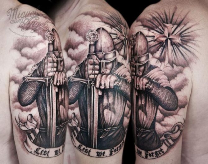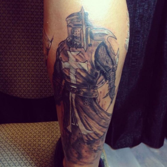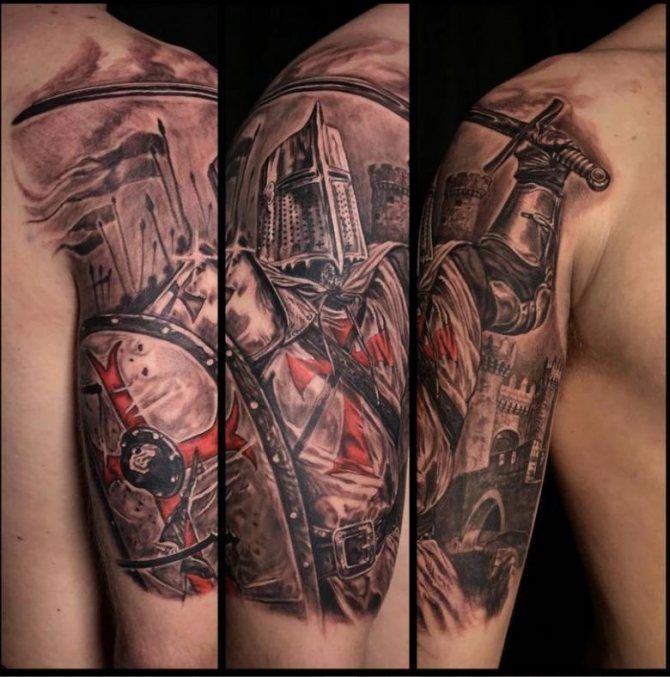 When the patience of the people and the secular and ecclesiastical rulers of Europe had reached its limit, a march to the East was announced in Clermont. Those who wished to take part stitched a red cross, from which the term "Crusaders" originated. All this was the reason that the tattoo "Knight" stuffed himself with guys with a huge heart, which will never pass by the offended, not rendering him effective help.