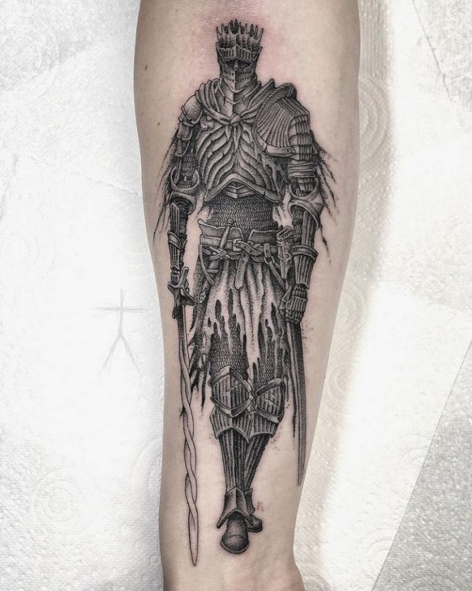 A knight, the image of which speaks of the courage and bravery of the owner. The warrior is stuffed by people seeking to live by a moral code. The drawing is done in a graphic or realistic manner. The perception of the drawing is influenced by the knight's pose and the weapon in his hands.