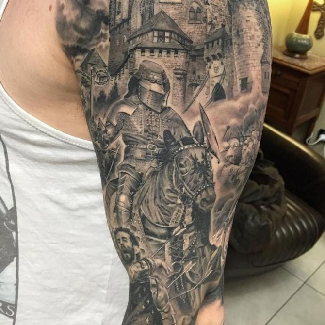 The optimal place for the tattoo "Knight" on the body of a strong young guy can be considered a muscular shoulder. The head on the shoulder or picture-sleeve can be implemented in any technique and with the use of a wide palette of pigments. In a monochrome version of the tattoo of this theme also look very spectacular.