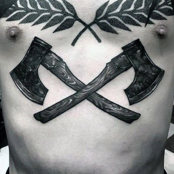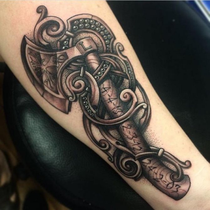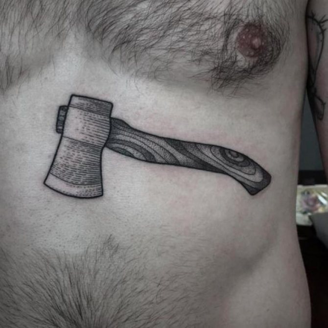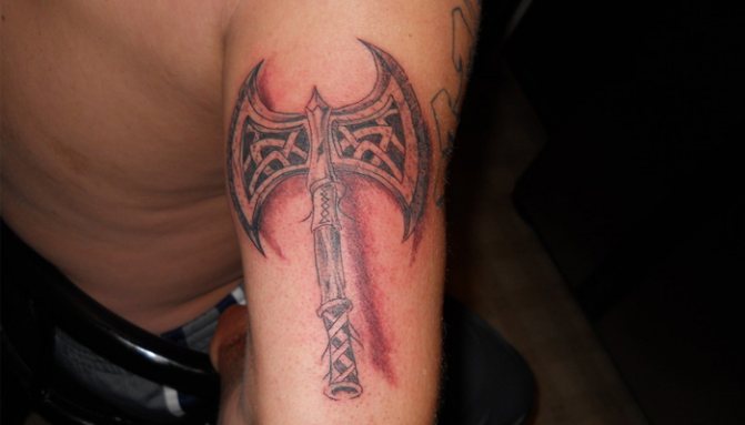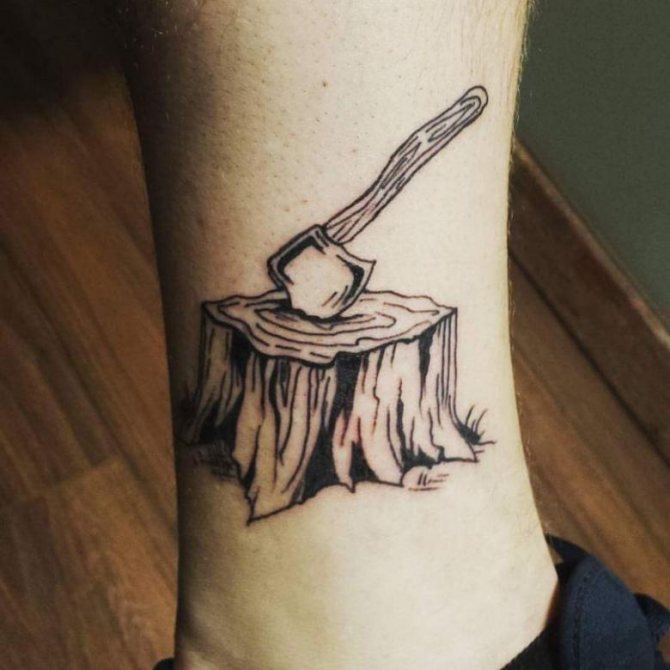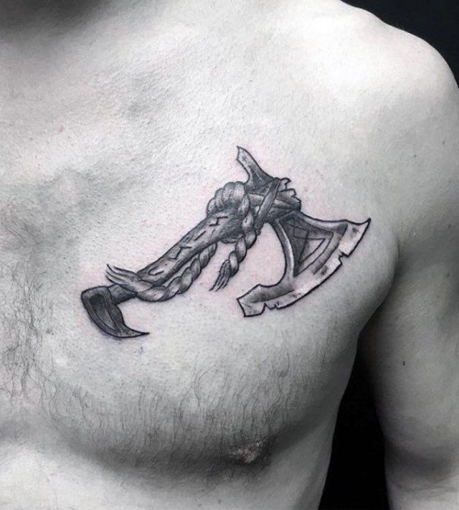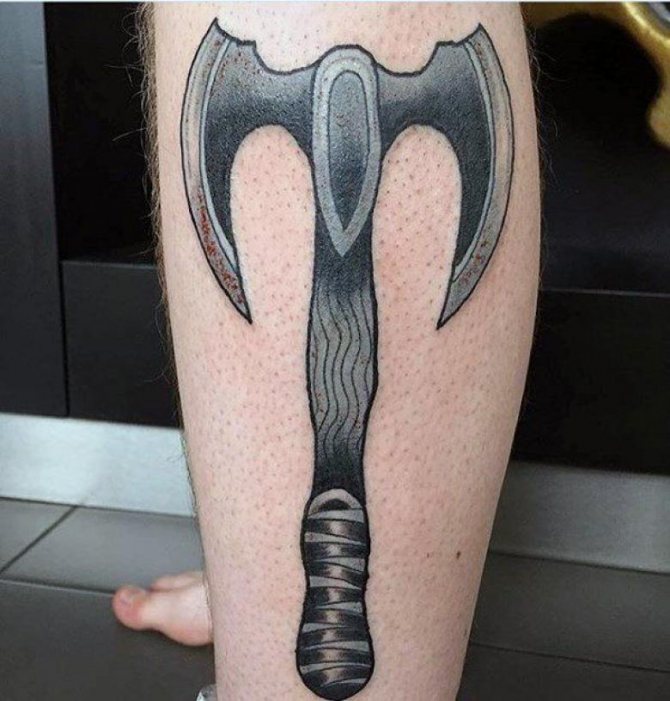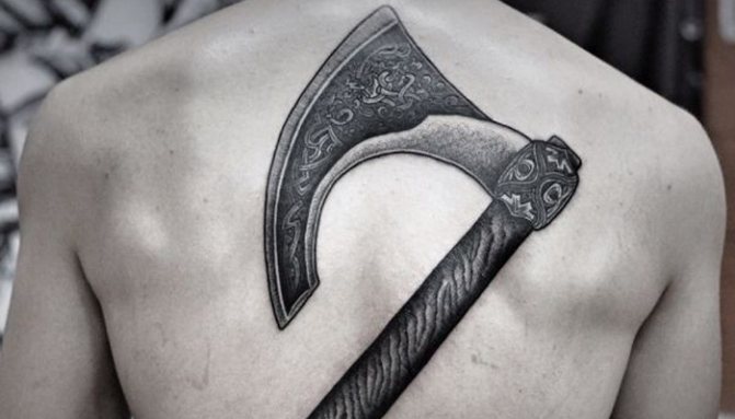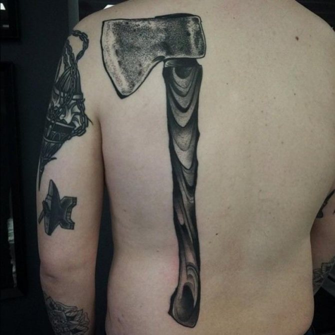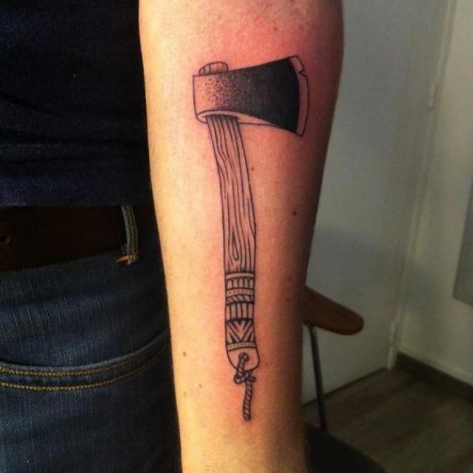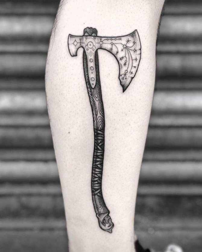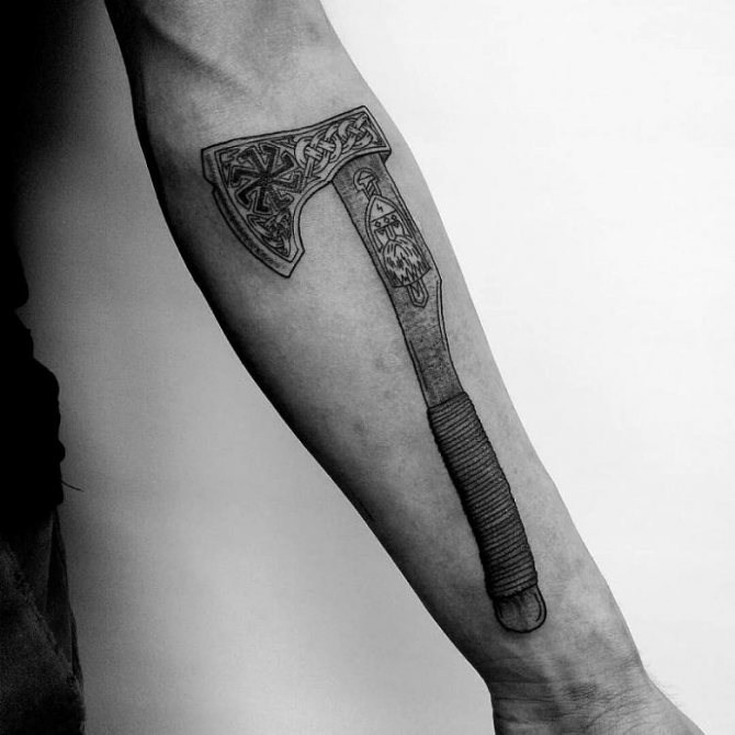 The axe was a symbol of Perun, the Hindu deity Parashuram, the Scandinavian god Thor, etc. The axe as a tattoo began to be applied by the Vikings in order to saturate their bodies with great strength and strength of spirit.