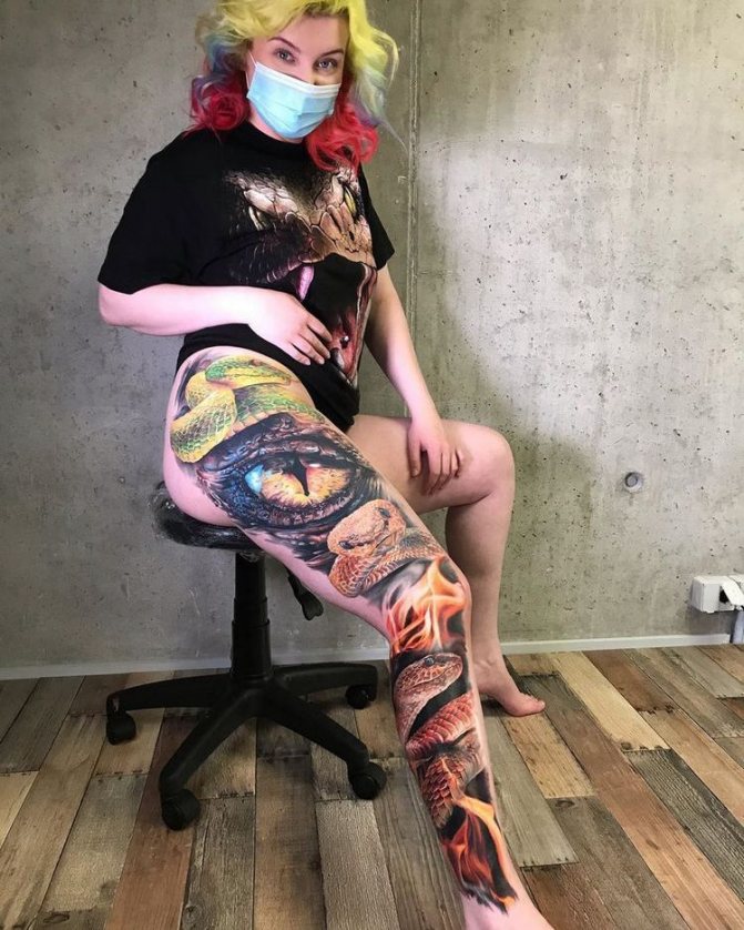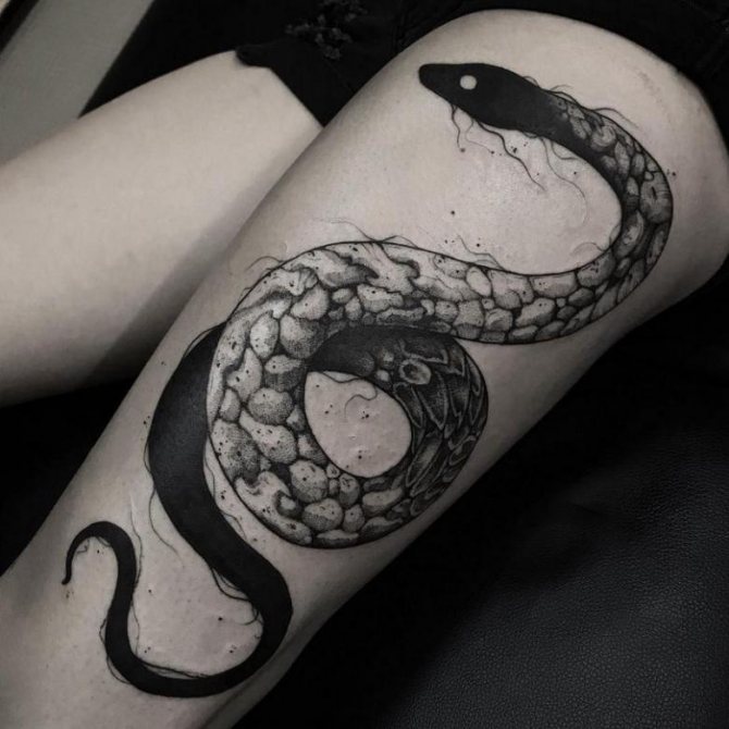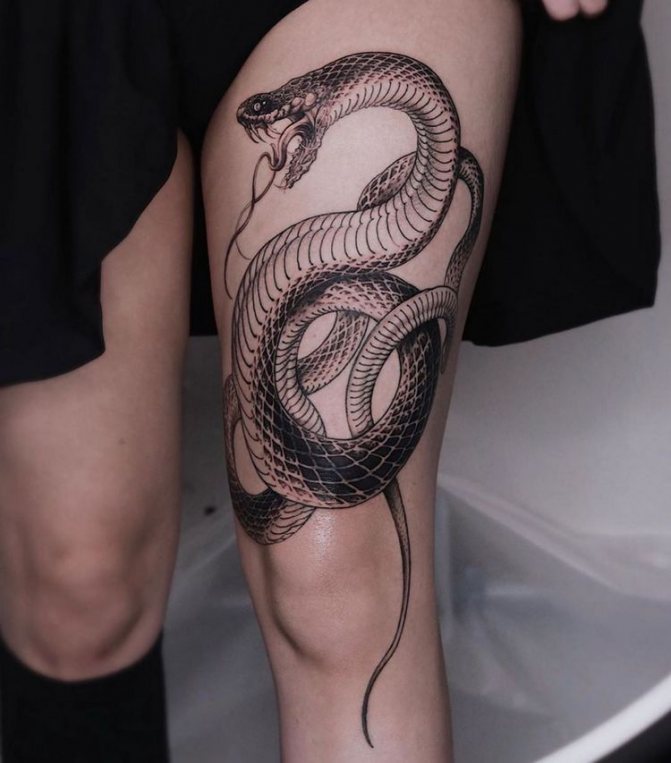 The thigh will allow to reproduce, as a large-scale canvas, as well as to realize the idea of location on the front, side and even back of the thigh. The reptile can seamlessly wrap around the leg, highlighting its slimness. Such an image on a woman's ankle will give an elegant expression. The tattoo is also printed on the chest, back, stomach and ribs. The variation on the neck is interesting.