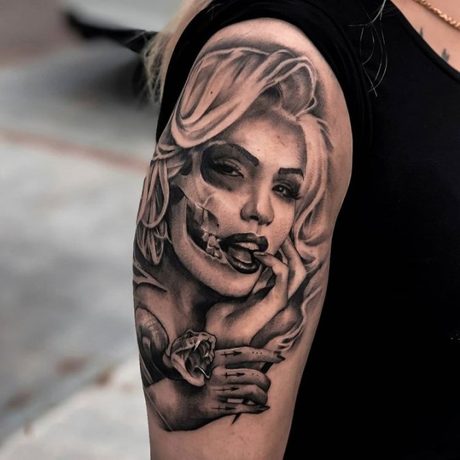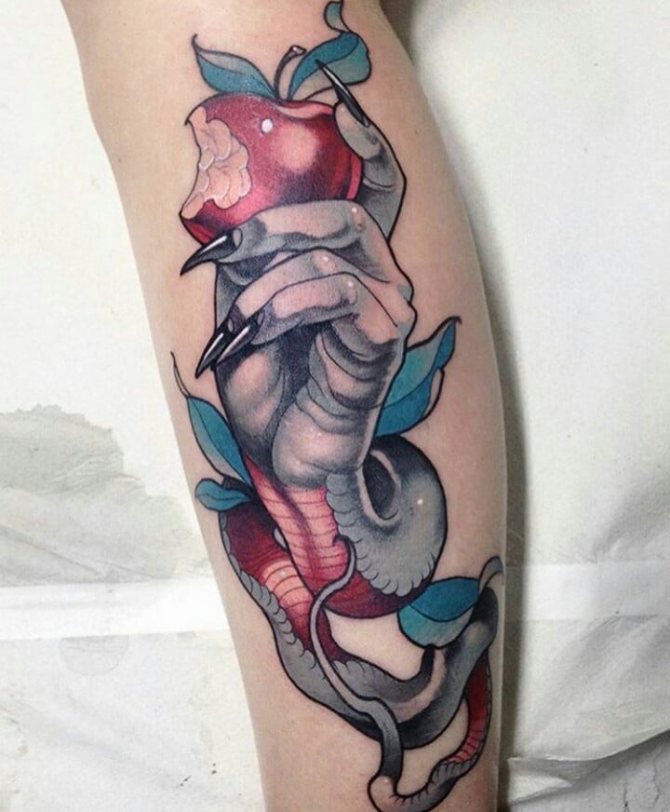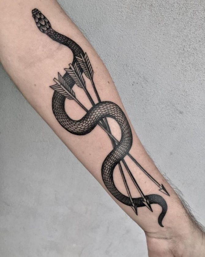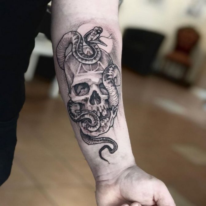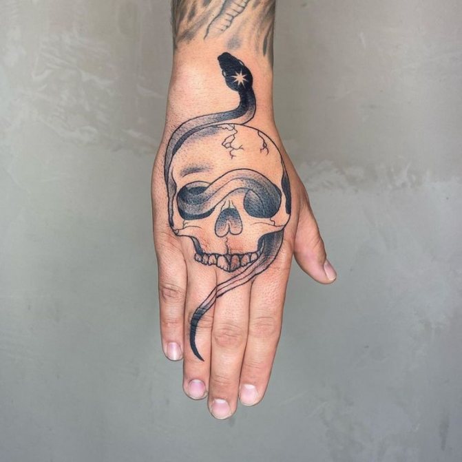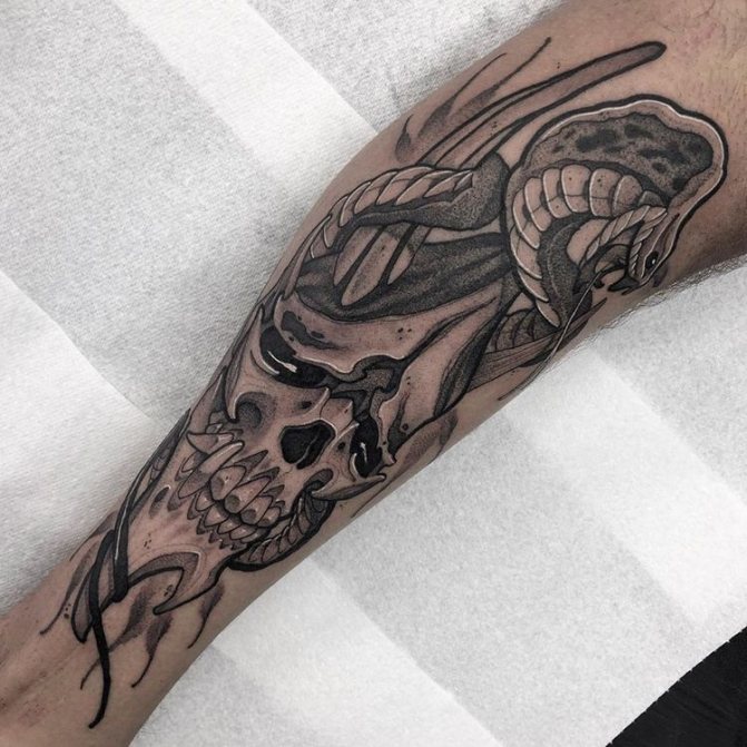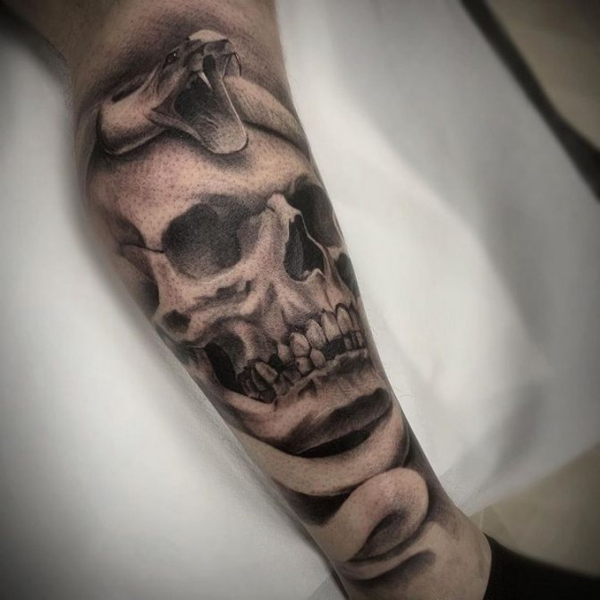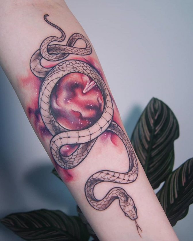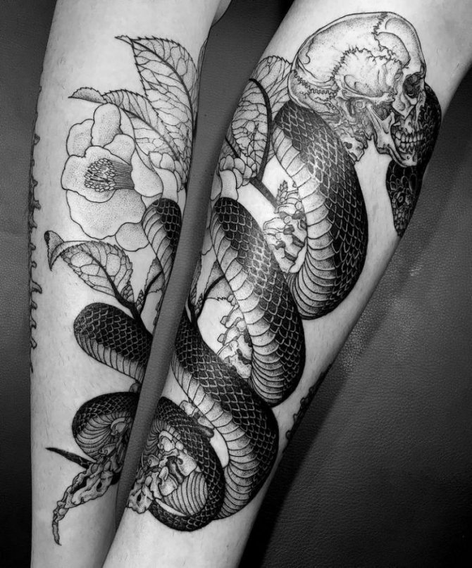 In some combinations, the snake in the picture symbolizes the frailty of all that is happening and should remind the owner and those around him that nothing is forever in this world. Typically, in such drawings, the remnants of human bones serve as a background. In a mystical sense, this tattoo symbolizes that the world has a beginning and an end. In this version, the snake must hold an apple in its mouth as a symbol of the beginning of life, and the human bones denote nothing less than its completion. The same meaning is given to the serpent perched on the crown, carved on the forearm and in the area of the abdomen.