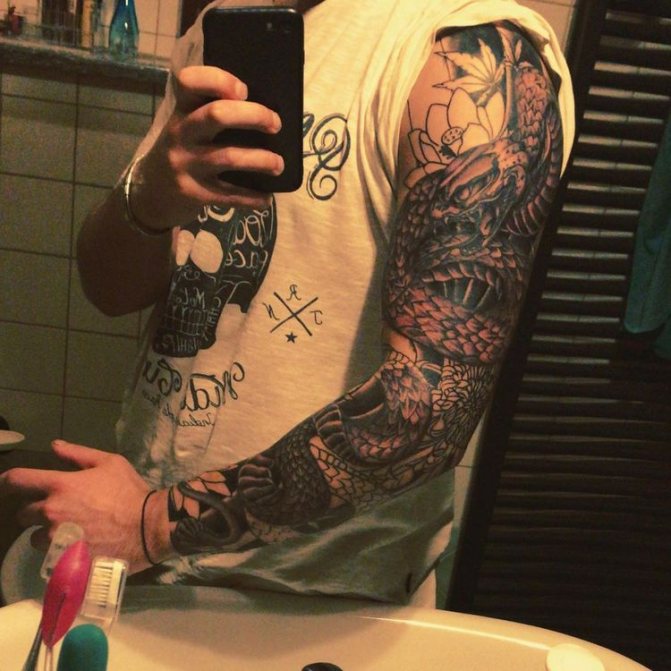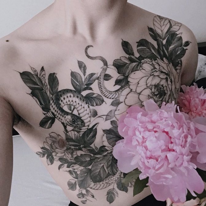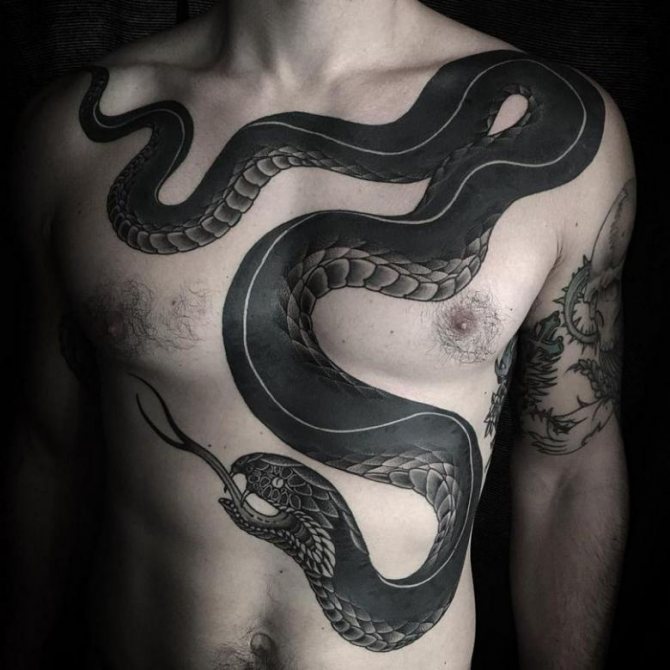 Large tattoos of snakes more often do in the traditional or Japanese style. They are tattooed by both men and women on all sorts of body parts that have a large surface area for drawing. Japanese snake tattoos can be located on a person's arms, legs, back, chest and abdomen. Often the snakes wind around the arms or legs, moving to neighboring parts of the body. For example, one of the classic variants of tattoos in men begins on the chest and moves to the shoulder. Such tattoos are difficult to hide, and their owners are not particularly eager to do so.