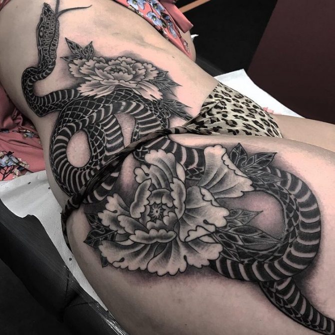 Heavenly life, harmony with himself and the world around him - so interpreted natal composition with flowers, around which obvivivaetsya snake. The snake, hidden in a flower, holds a special mystery. Looking at this tattoo, you begin to wonder whether this cold-blooded animal is going to attack or just peacefully basks in the sun, gently swaying on a flower trunk.
