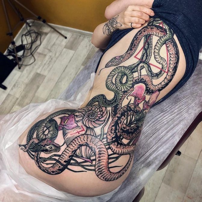 All areas of the skin on the human body can be used as a canvas under the tattoo, except for some nuances, men do not put the snake on the lower back (unless it takes the whole back), this place is considered purely female.
