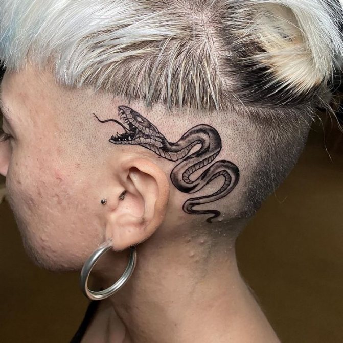 The most daring and fanatical adherents of the art of body art put her image on the head, the snake as if crawling out of the neck area and moving towards the face above the ear. Such a tattoo looks very bold and provocative, at the same time this part of the head must be shaved. If you grow your hair long enough to hide it, then you can go to the office without any problems.