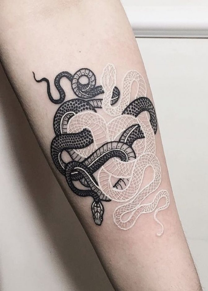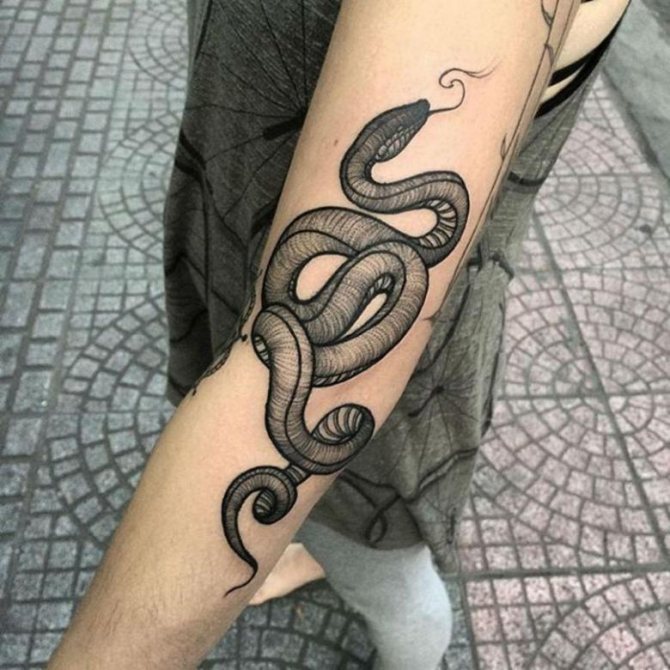The Snake tattoo is a versatile drawing capable of fitting into any space and appearing or popping up in the most unexpected places. And yet the most popular locations of tattoos with its image is the forearm of the hands, where it is able to wrap in a few coils and thus create a bracelet.