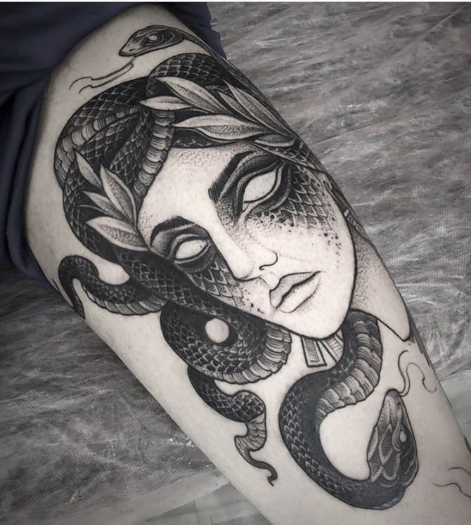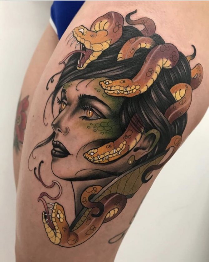 Despite some aggression in the behavior of many snakes, men prefer to use its image as the main drawing in the overall natal composition. It is not uncommon to see a snake crawling over a human skull on a male body. Another popular male option was the image of the jellyfish Gorgon, whose hair is a snake.