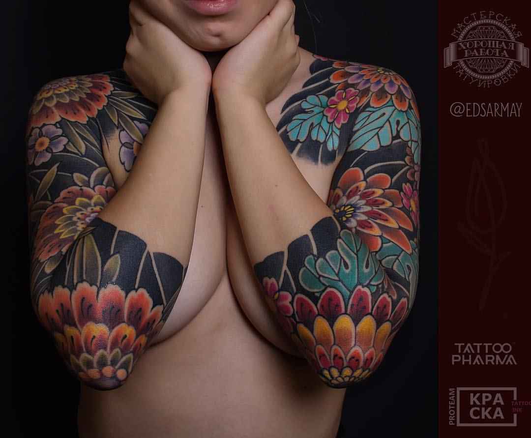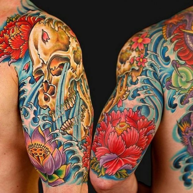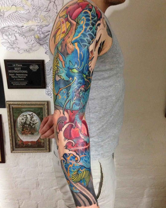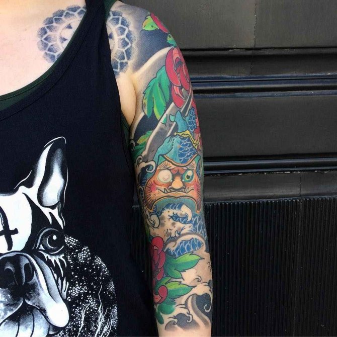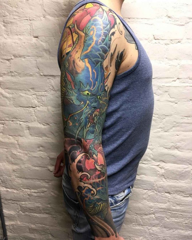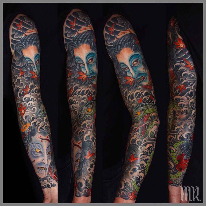 In the past, tattoos in the form of a sleeve were among the special privileges of Japanese men. Only emperors and the ruling elite were awarded such honors. Only the best craftsmen were allowed to do it. The sleeve starts from the hand and goes up to the shoulder area, the image goes through the elbow and forearm. Tattoo on a hand in a classical variant to a sleeve does not concern. The working surface is quite large, so the tattoo sleeve is performed as a single story composition, and separately - such drawings are collected from several, not interconnected sketches. However, the most widespread in Japanese culture was the first option, which makes it easy to recognize the semantic message of the tattoo.
