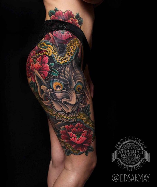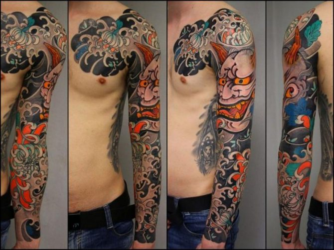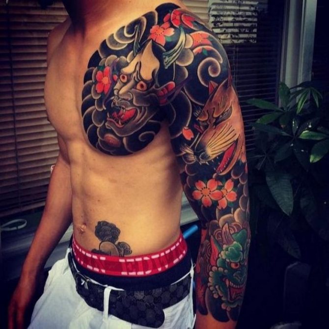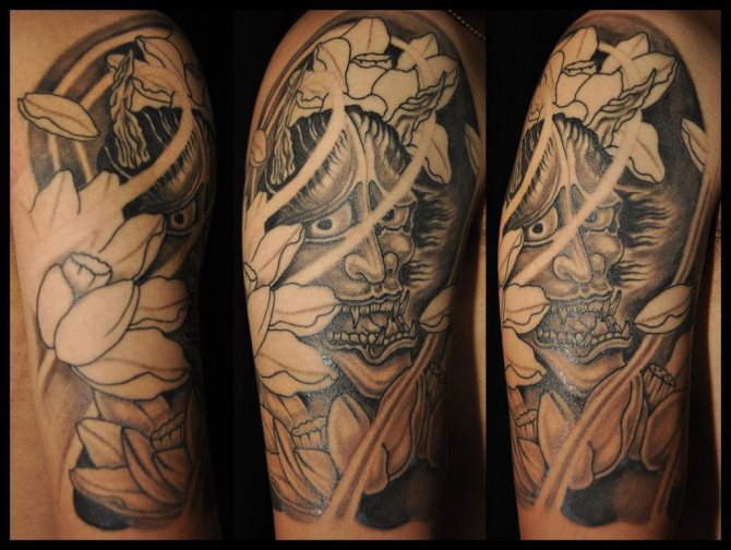 The source of inspiration when choosing a drawing is the mythology of Japan. Many people choose masks and faces of demons as tattoos. If you choose the right image, the picture can become the most powerful amulet and amulet for its owner. But it is worth remembering that the meaning of the tattoo is influenced by many factors: the position of even minor details, the general location on the body and color.