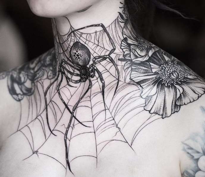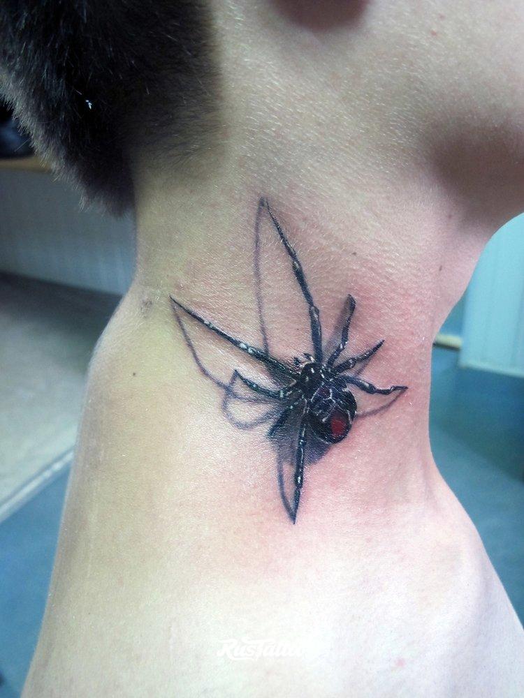 Spider in this style is depicted, in most cases, as the main building block of the entire tattoo, while, he painted he can be abruptly, lines or solid pieces of silhouette. Tattoo is popular with both men and girls. It can be applied anywhere, depending on the size of the picture itself.