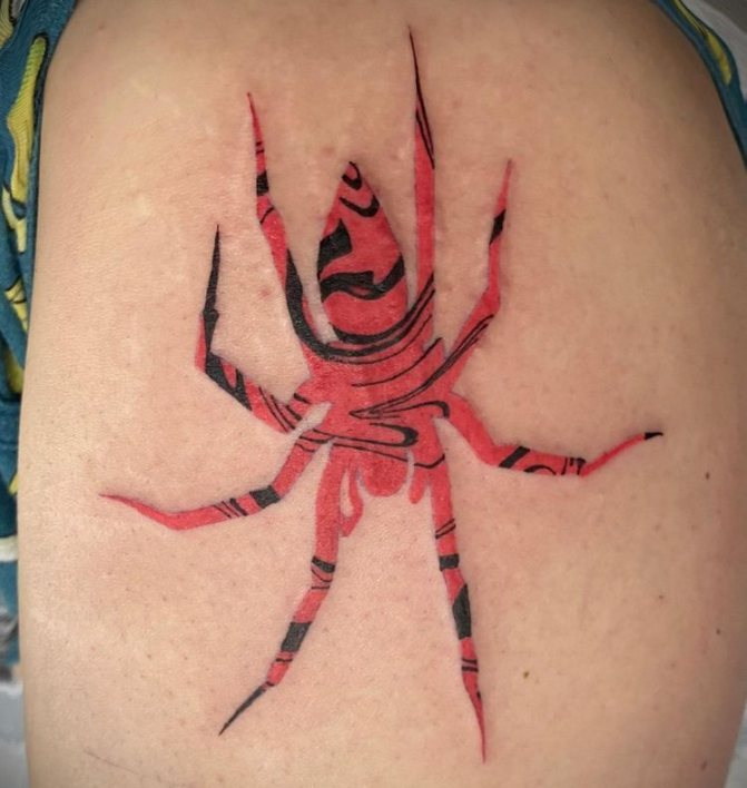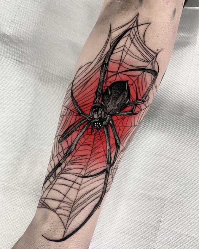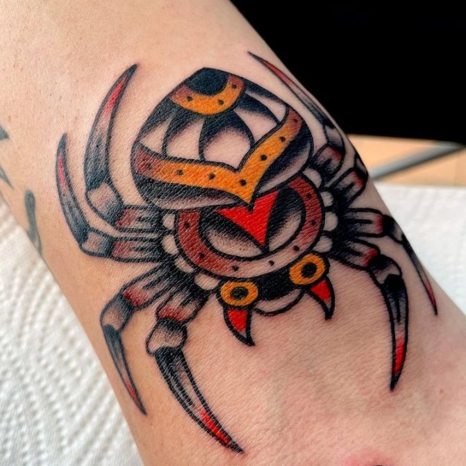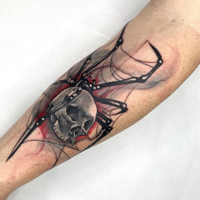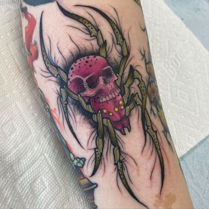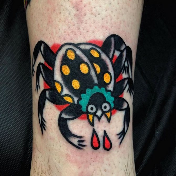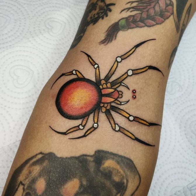 All colors are used, including even the white color. A spider is used as an additional element to the main object. It can even be done as a tattoo on the body of a stuffed character. Thus we get the effect of "tattoo in tattoo", which looks very interesting. If an insect is depicted as the main element, then draw it, in most cases, against a burrow, skull, or as a symbol on a flag.