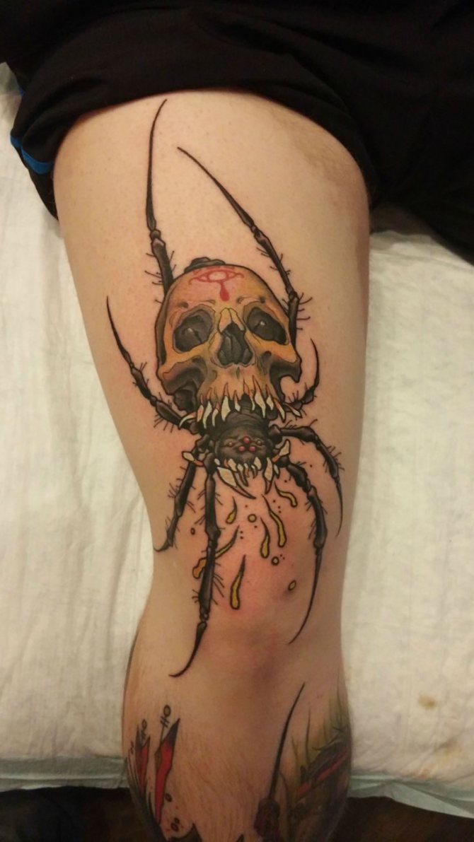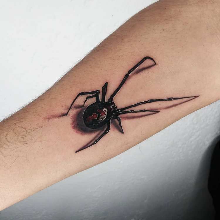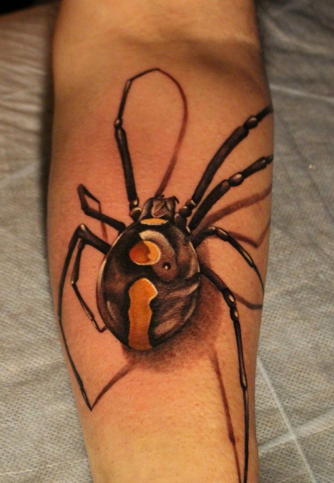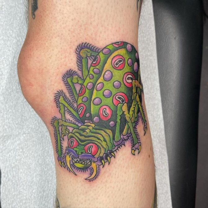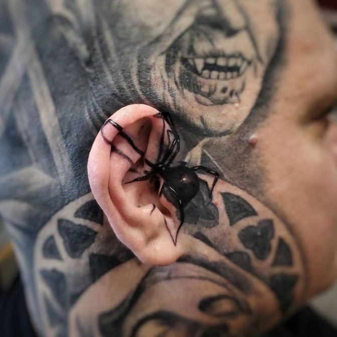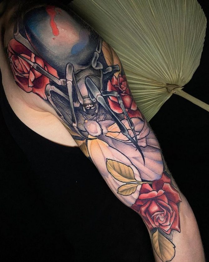 All colors are used, including even the white color. A spider is used as an additional element to the main object. It can even be done as a tattoo on the body of a stuffed character. Thus we get the effect of "tattoo in tattoo", which looks very interesting. If an insect is depicted as the main element, then draw it, in most cases, against a burrow, skull, or as a symbol on a flag.
