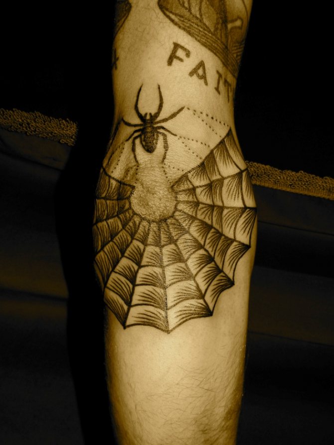 Wearable designs in the form of a spider's web have been used for quite some time. Even the South American Indians could see such a tattoo. At that time, it meant protection for its bearer, as well as the reliability of the protection. It was used not only on the body, but also hung as a talisman over the crib of the child. The spider was considered sacred, so he was worshipped for a time. Directly a tattoo had the following meaning: guiding threads, intertwining of destinies and movement of life in a circle.