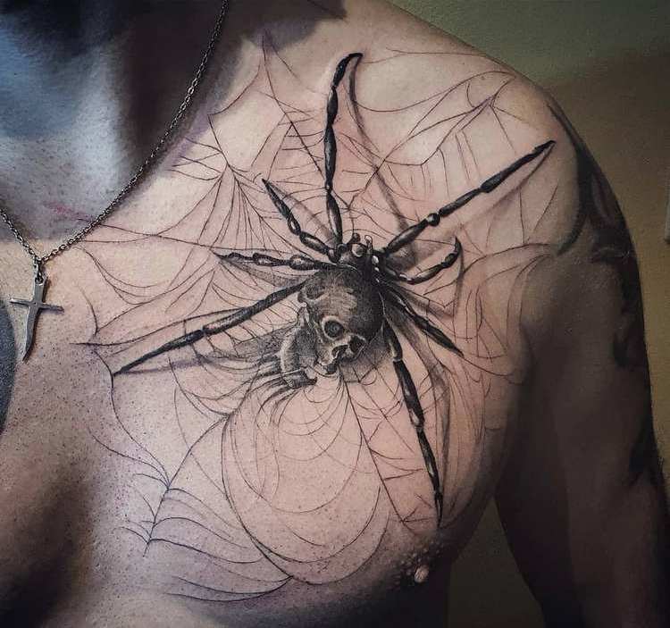 Men's spider tattoos often depict large spiders, in a slightly dark noir style. Men prefer large tattoos in the oldskool, newskool, and engraved styles.