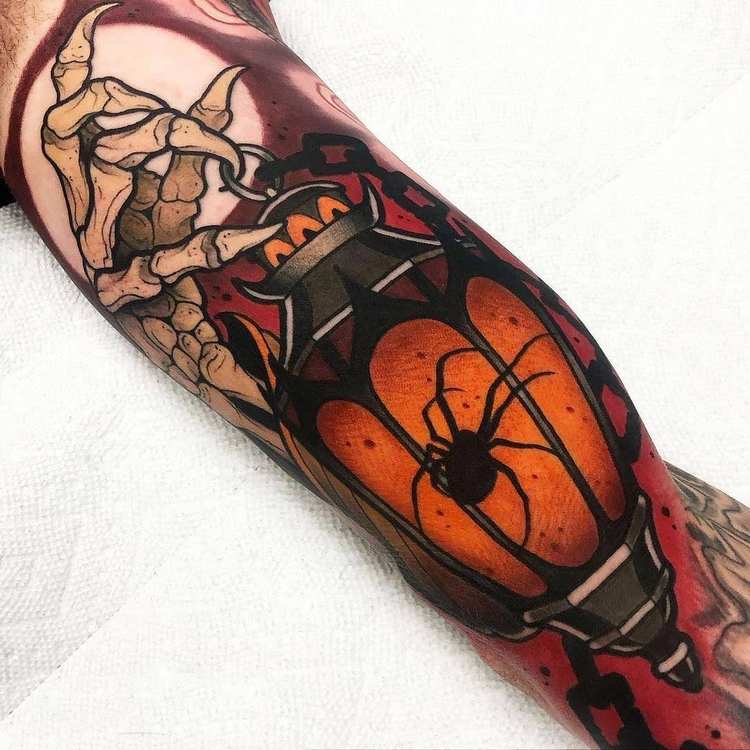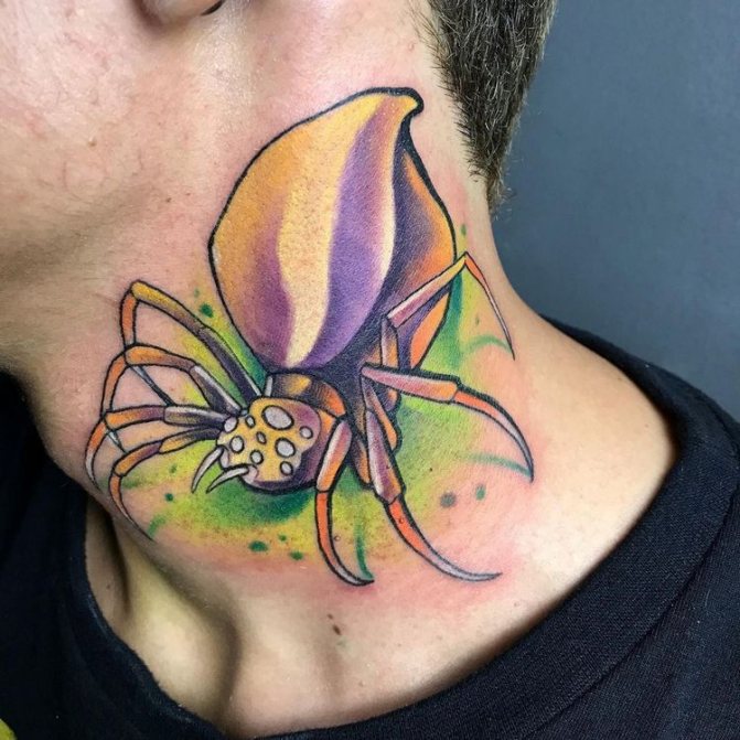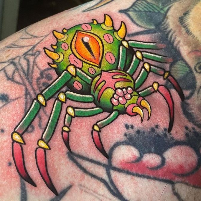 The plot in Newschool can be anything, in most cases it is something fantastic. The spider can be used as the main element, as well as an additional element. Most often it is drawn in a rather cartoon style, which gives its own, unique style Newscool. Moreover, no special detail is adhered to, because the tattoo emphasizes the brightness and juiciness of the image.