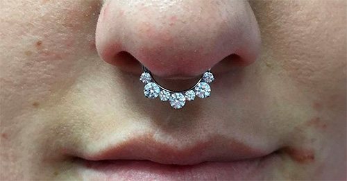 To perform "septum" piercing, it is undesirable to use bananas. In these ornaments there is no pronounced center of gravity. Therefore, they can slip to one side, which looks not very aesthetically pleasing. In addition to bananas, it is undesirable to use a barbell to make the primary piercing, since it is impossible to know whether the hole is evenly placed. By inserting a ring or clicker, however, you can immediately see the error and correct it.