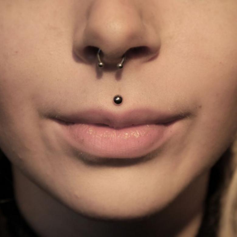 Septum piercing is a great way of body modification, which is suitable for men and women. Since the puncture is made just above the cartilage, the decoration will not hang over the lip. When the procedure is done correctly, the decorative element protrudes from the nostrils by 2/3. This is quite enough to create a spectacular image and comfortable to wear.