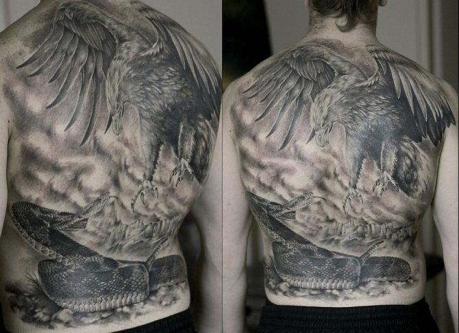 Tattoo eagle on the chest or other parts of the body can change its meaning if you look closely to the additional details depicted with it. Predatory, proud bird, grabbing the snake with its powerful claws and tearing beak - talking about the victory over the evil force. This is due to the fact that the snake has long been associated with cunning and evil.