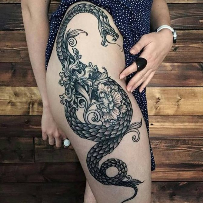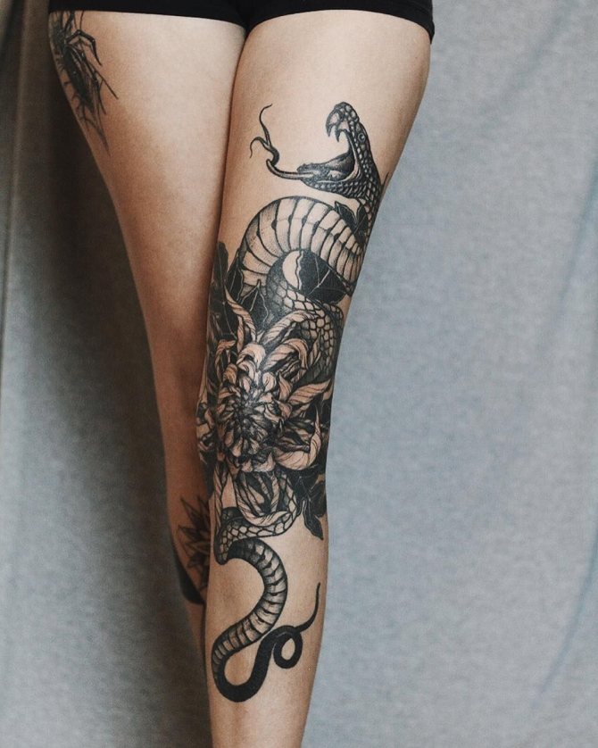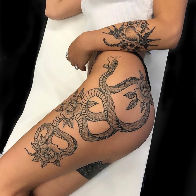 When applying a snake tattoo on this or that part of the leg, the master and the client have a huge opportunity to get creative and create a truly unique tattoo. It can be not just a miniature picture, but something large-scale, requiring the drawing of additional elements. A real springboard for creativity is the hip area. Tattoo snake on the hip will be a work of art, if you use additional details, as well as apply in the work of multi-colored paints.