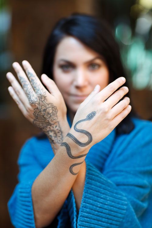 On the fingers is printed a small snake, which will adorn the elegant slender fingers of a young lady and add a certain style to her image. Do not do the tattoo on the inside, as there is a large amount of sweat glands and the picture will quickly lose its appeal.