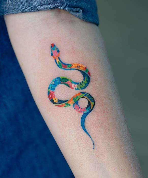 Snake tattoo on the wrist looks stylish and beautiful if you use additional elements in the picture. For example, a snake with a flower looks more feminine than just the image of this reptile.