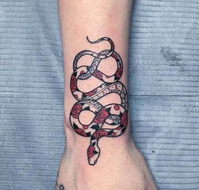 Tattoo in the form of a small snake most often depicted in girls is on the hand. Draw it in white or red paint, which gives the image additional charm. Such a tattoo can be complemented by any decorative elements (for example, roses). Also with the tattoo will be combined with any jewelry that girls love to use.